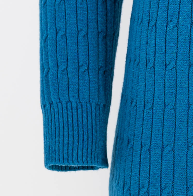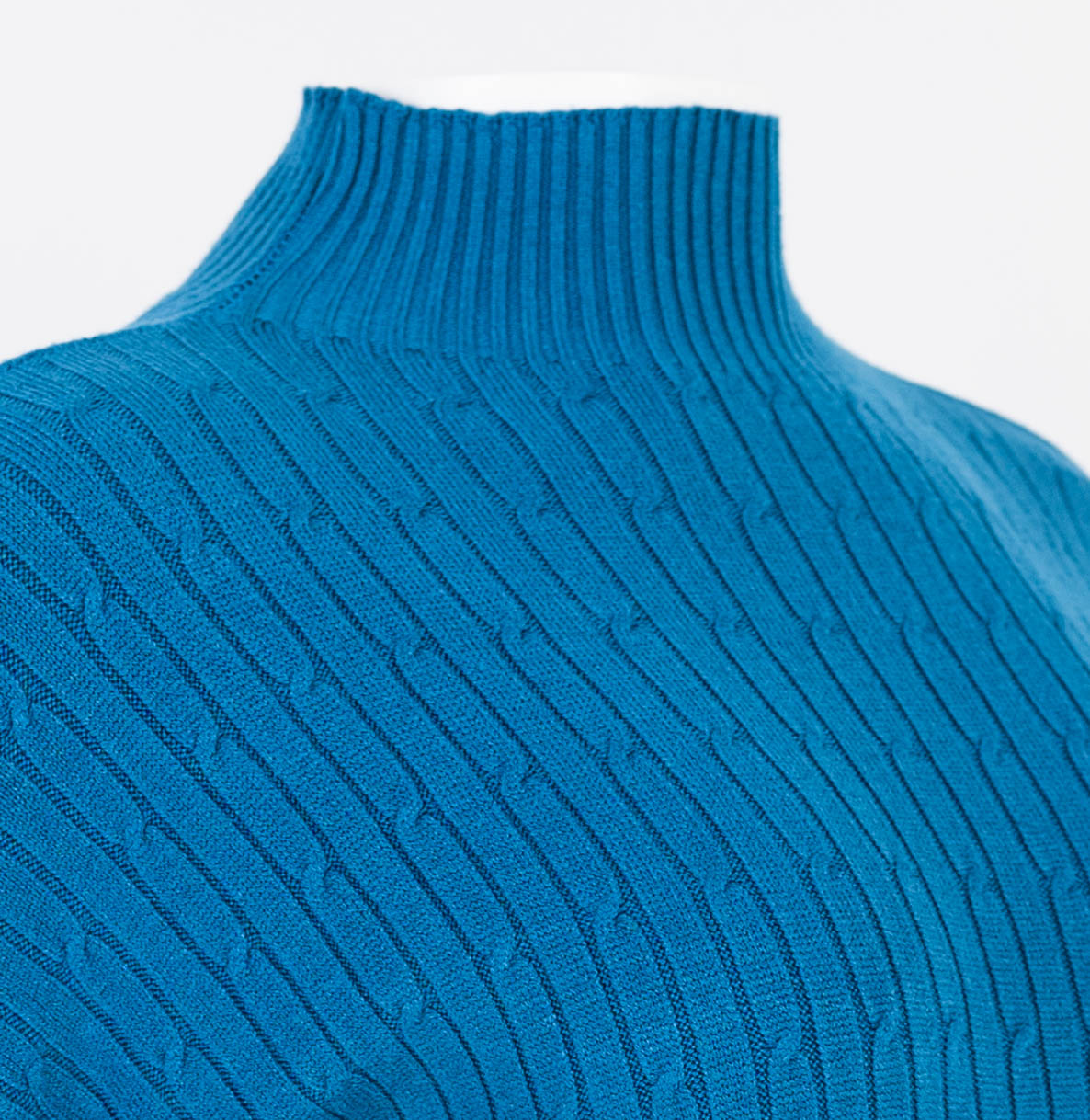 Релефна плетка „кабел“ по цялата дължина Полу-поло яка; рипсени маншети и подгъв за стабилна форма Еластична, мека и ненадраскваща материя Универсален размер – покрива до L