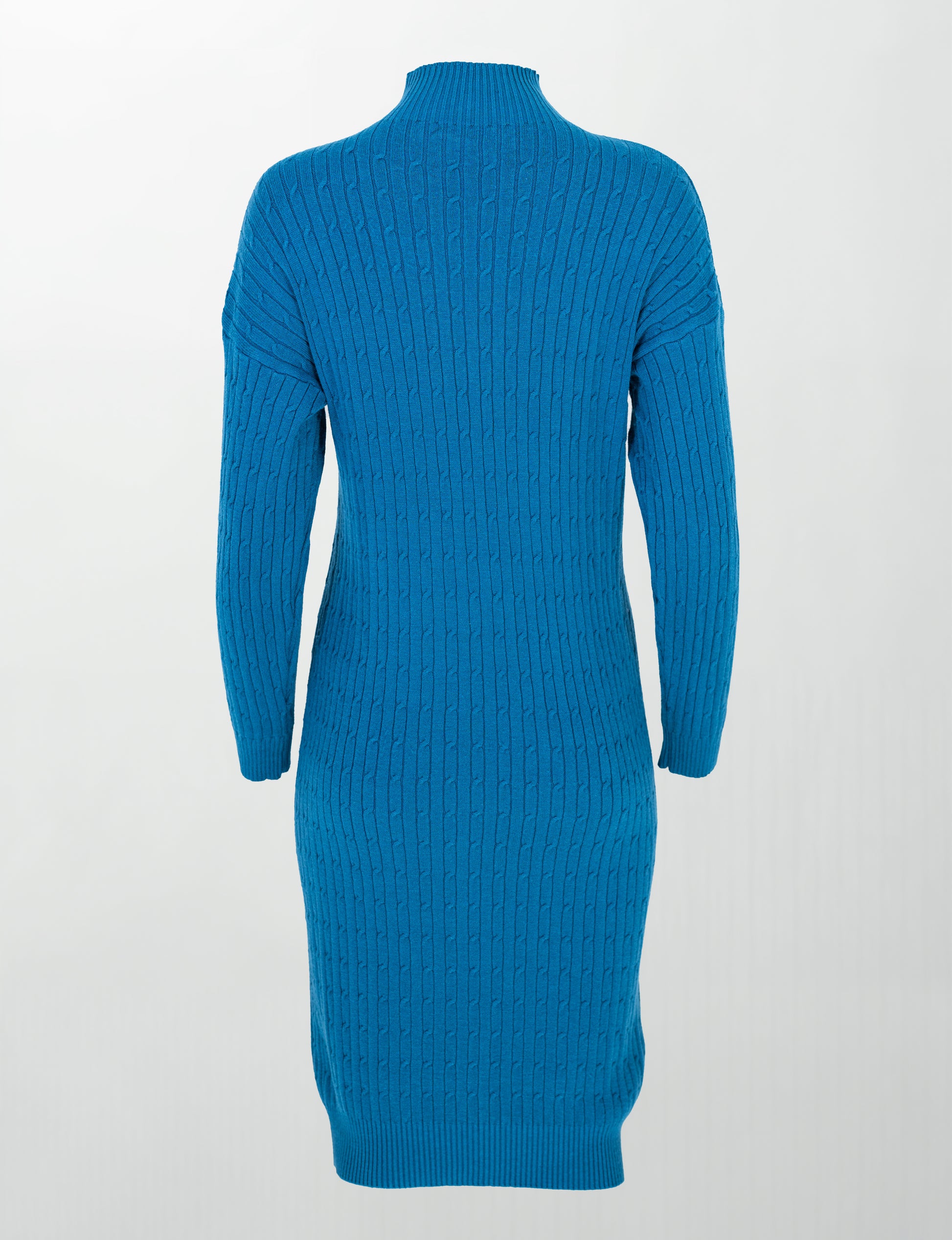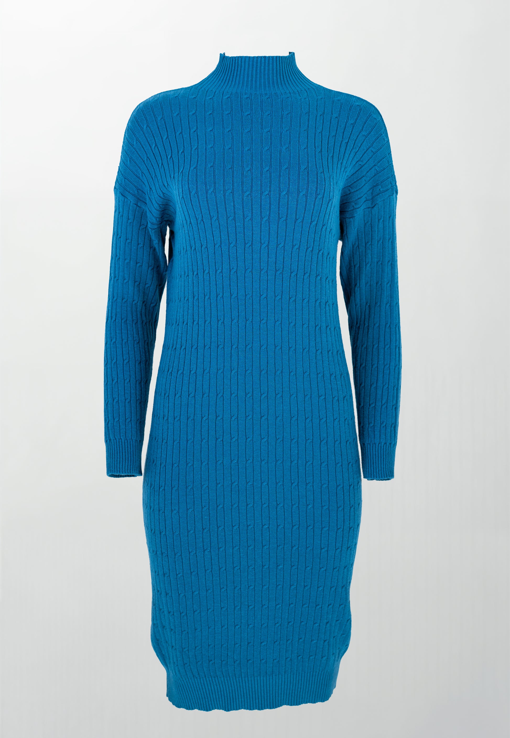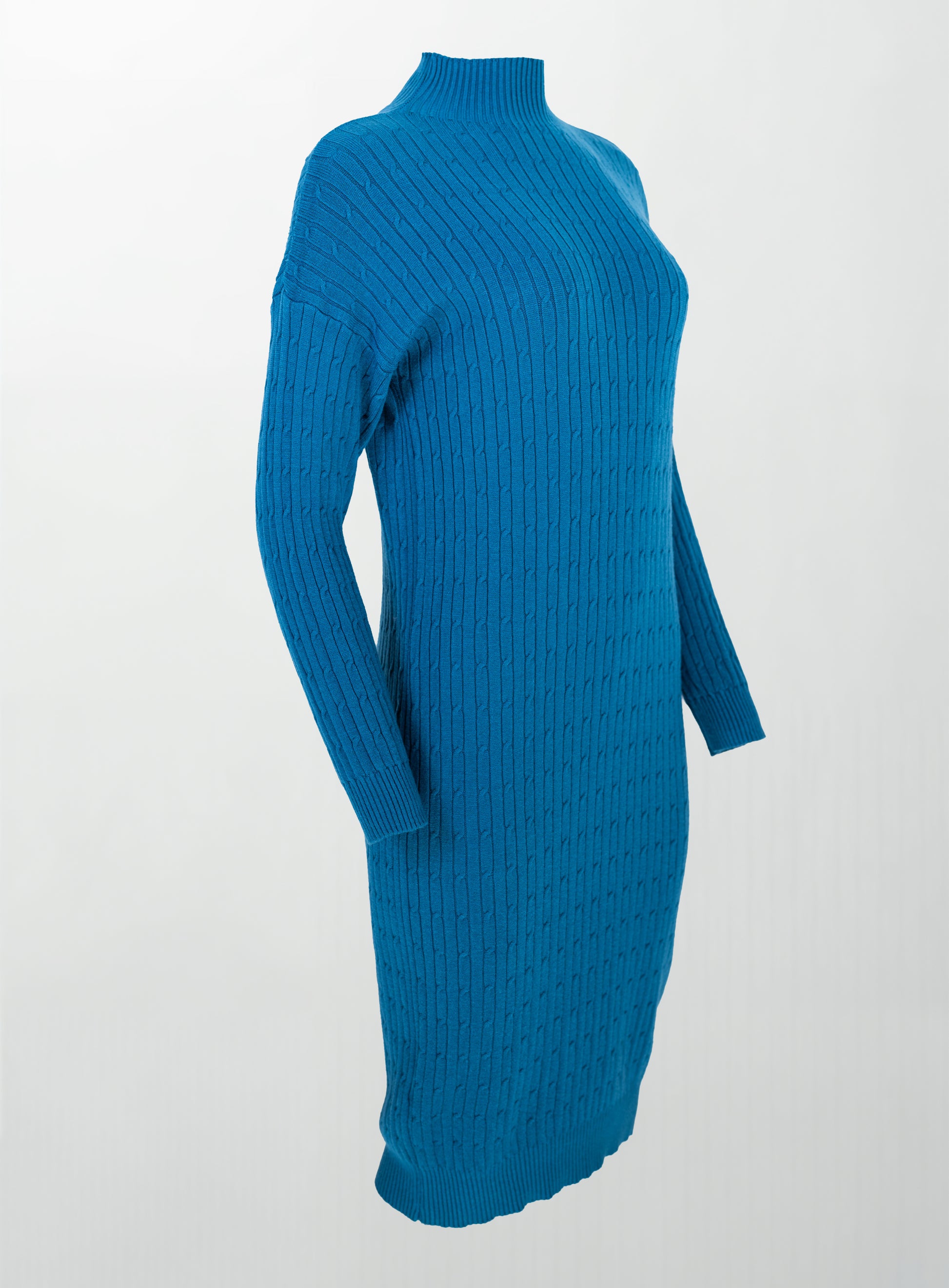Фина плетена рокля с вертикален релеф и изчистена линия. Полу-поло яката и еластичната плетка подчертават силуета, без да ограничават движението. Цветът е наситено син – модерна база за ежедневни и по-елегантни комбинации.
