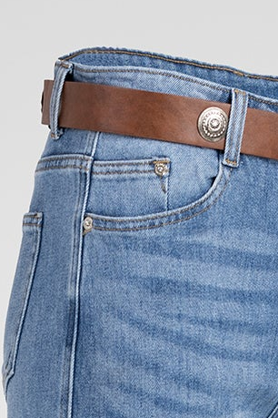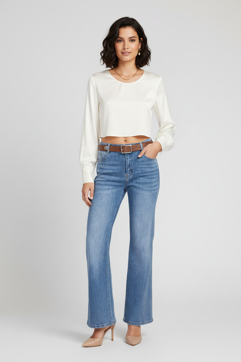 Blue Flare са дамски дънки в светъл син деним с разкрояване от коляното надолу, които издължават крака и подреждат силуета. Материята с високо съдържание на памук и добавен еластан остава стабилна на вид, но се разтяга при движение и осигурява комфорт през целия ден.