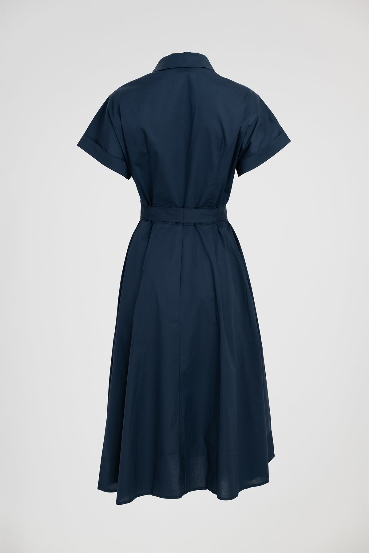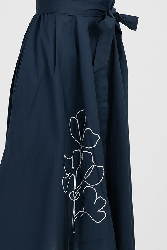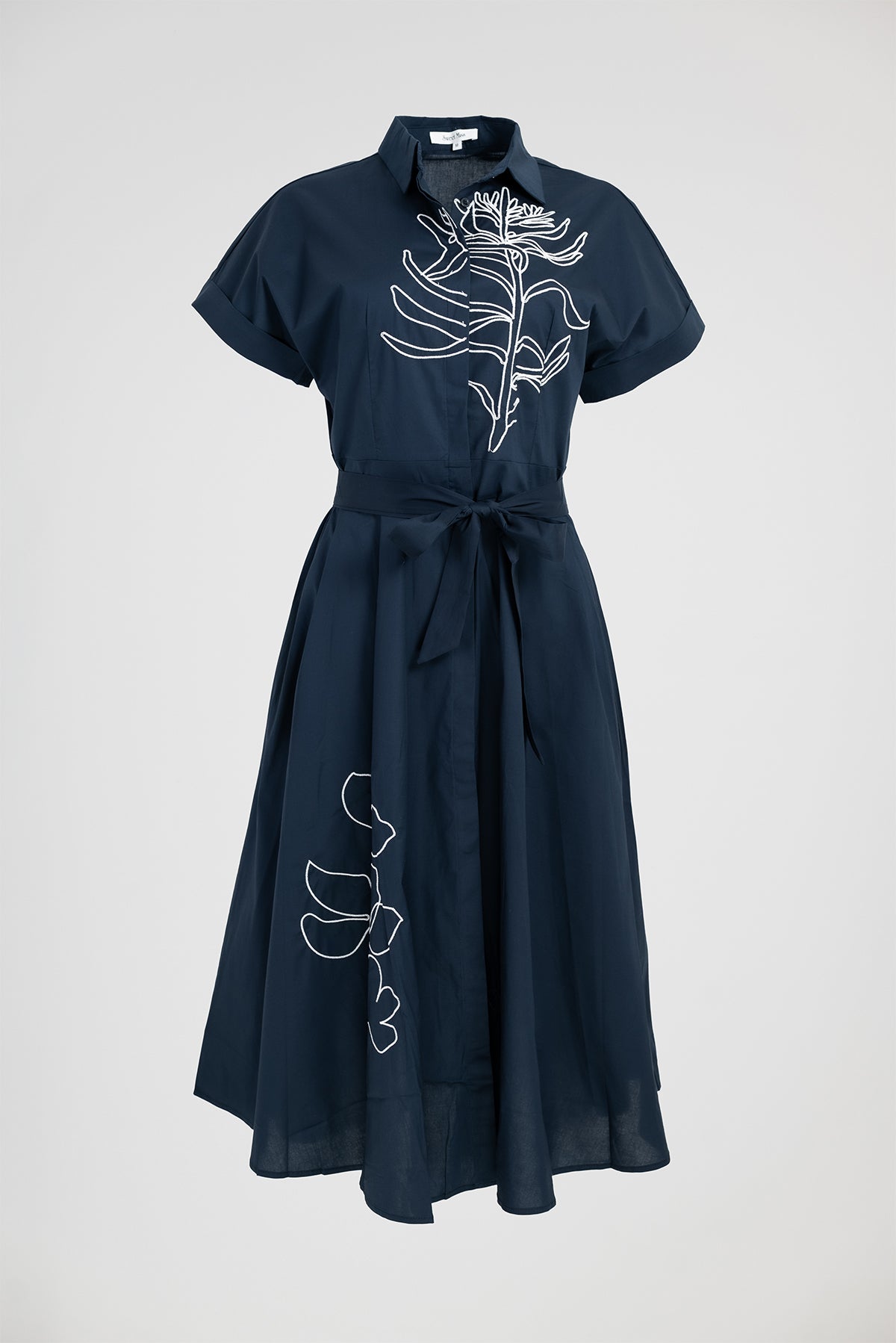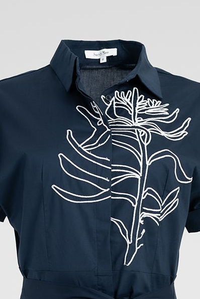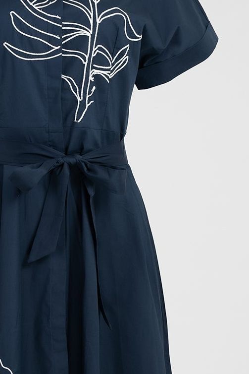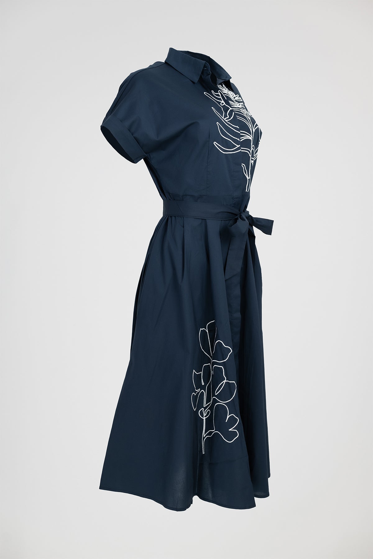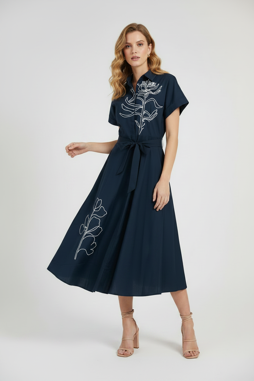 Dark Poetry е риза рокля в тъмно син нюанс с изчистена линия, колан в талията и артистична бродерия в контрастно бяло. Моделът стои елегантно, стегнато и женствено, като съчетава класическа форма с модерен акцент.