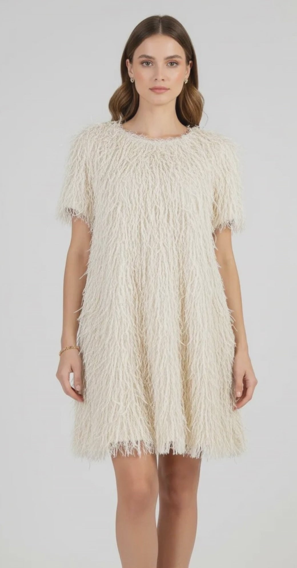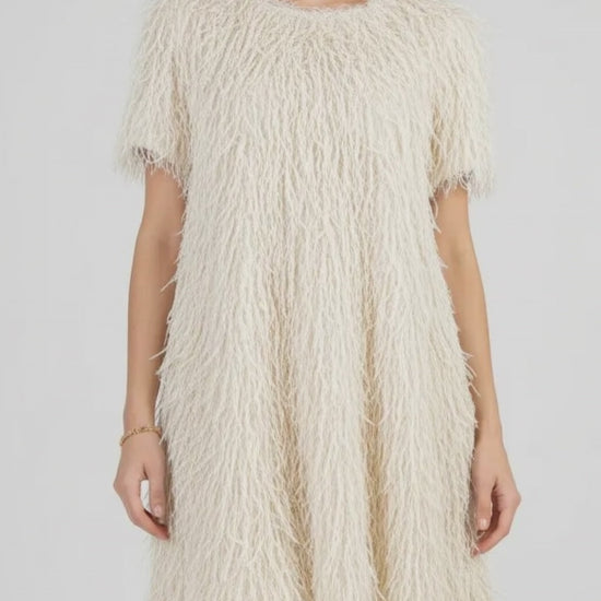 Disco Ivory е къса парти рокля с ресни в изтънчен цвят - светло бежаво. Свободният прав силует и фината текстура с движение придават луксозно излъчване и правят модела отличен избор за празнични вечери, коктейли и специални събития. Леката материя пада красиво и създава впечатляващ визуален ефект при всяка крачка, без да тежи или да очертава тялото.