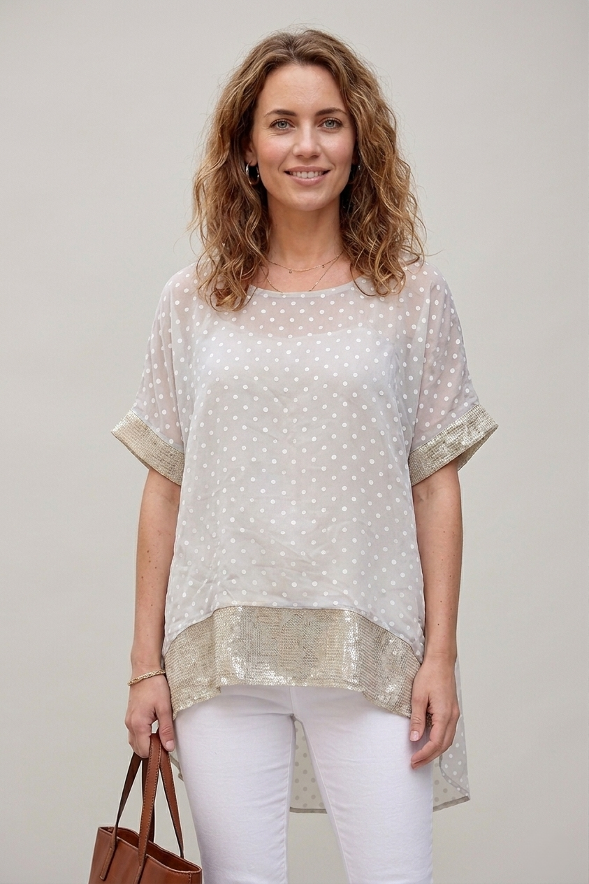 Dot Breeze е ефирна туника в бежово на бели точки, която носи свежо лятно излъчване и лек, небрежно елегантен стил. Свободната линия пада меко по тялото, а вътрешният слой с фин блясък добавя деликатен акцент и прави модела по-интересен и завършен.