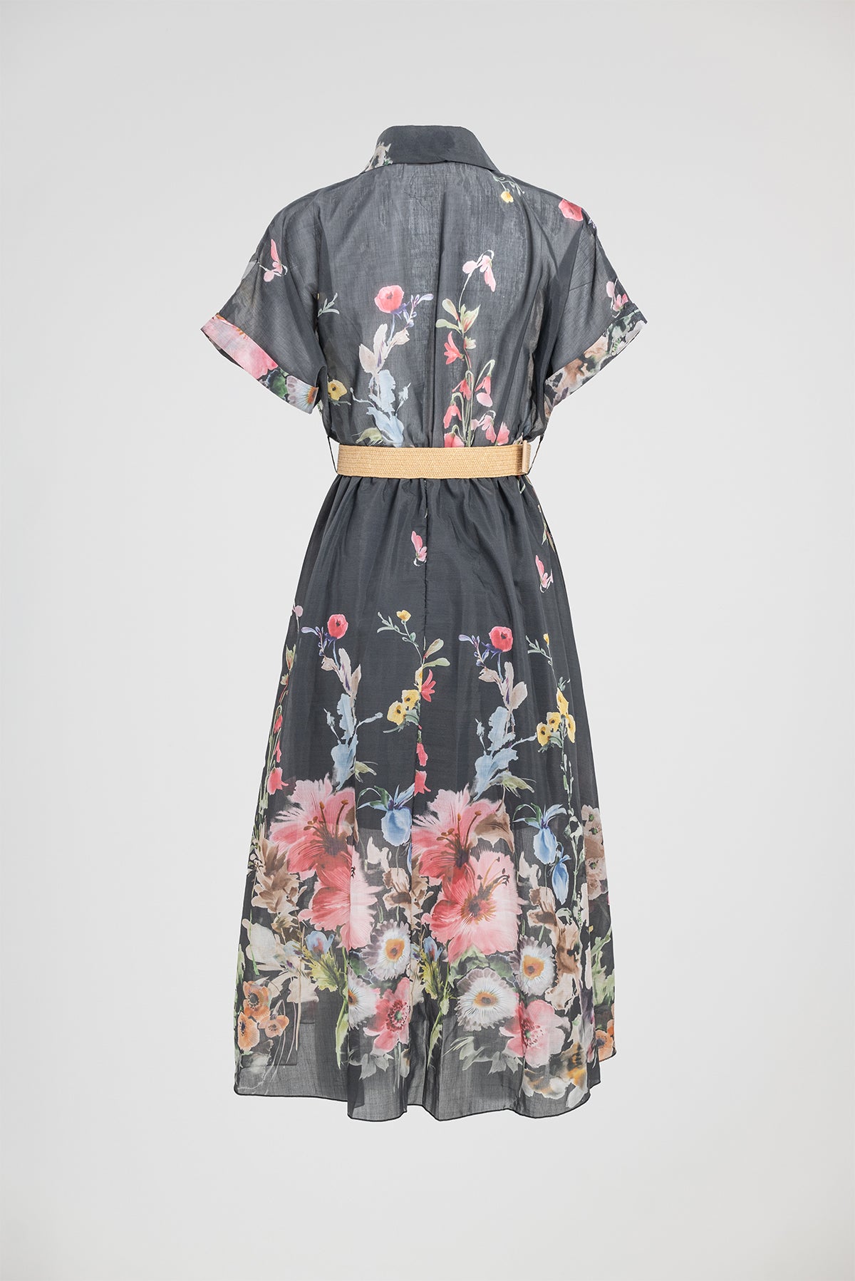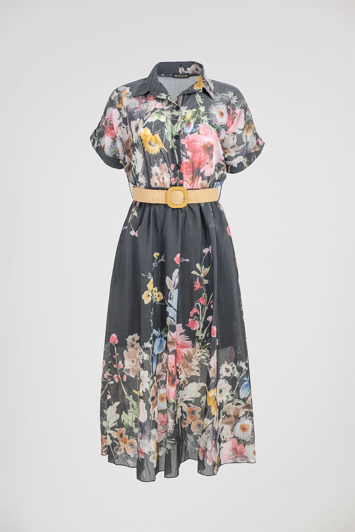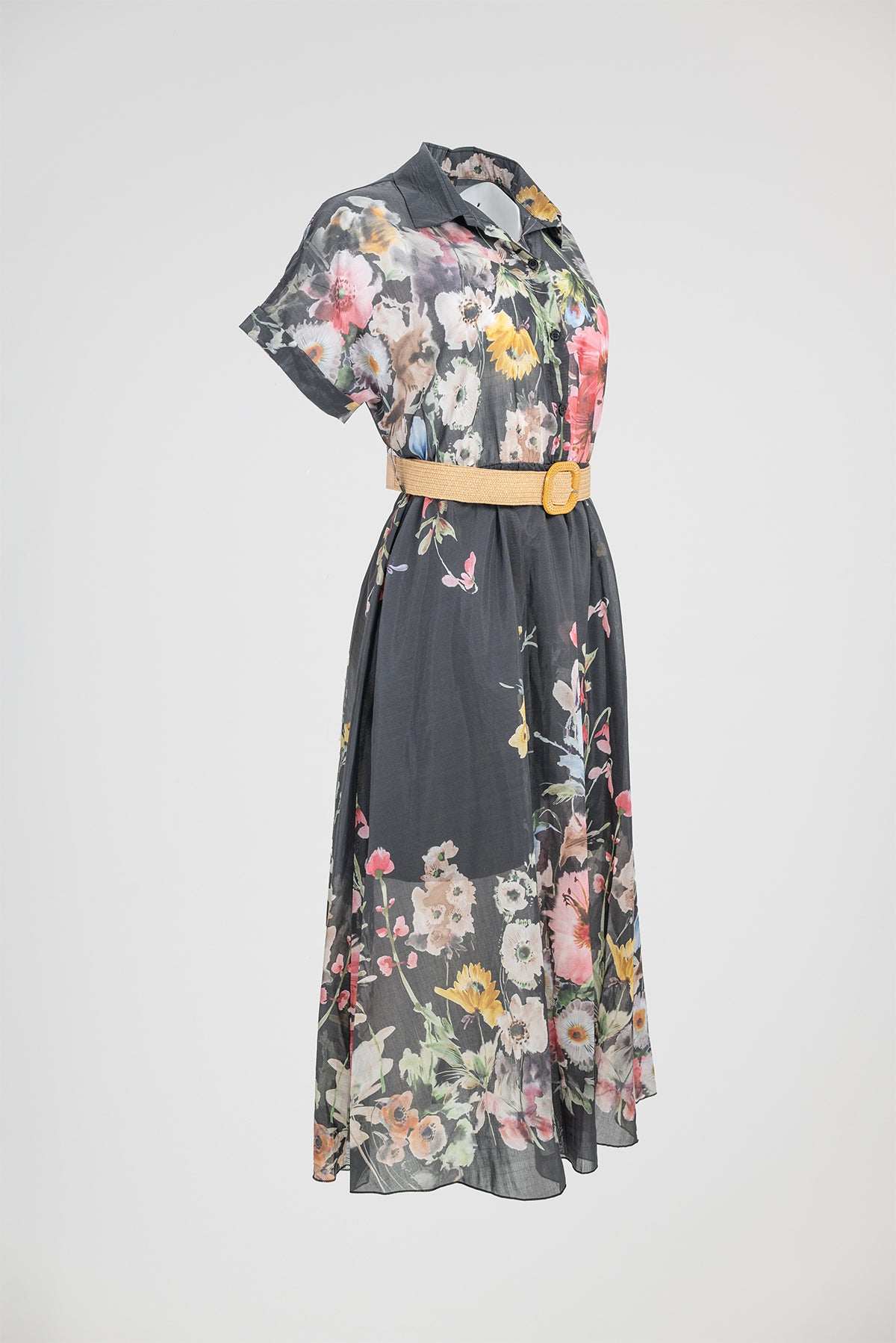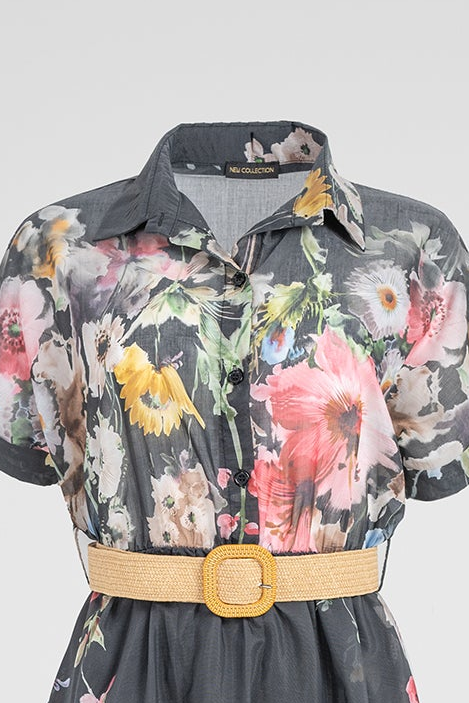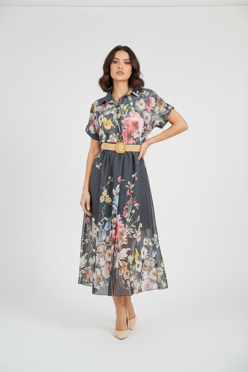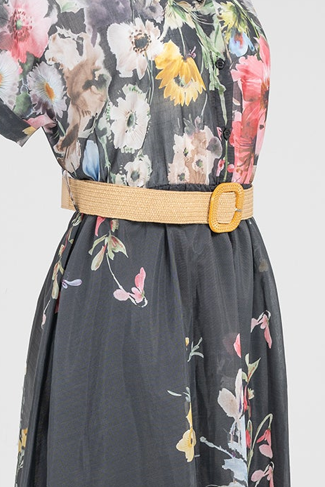 Floral Night е дамска рокля в черен нюанс с ефектен флорален принт и леко прозрачна текстура. Цветята в нежни тонове създават контраст и придават женственост, а коланът оформя талията и подчертава силуета.