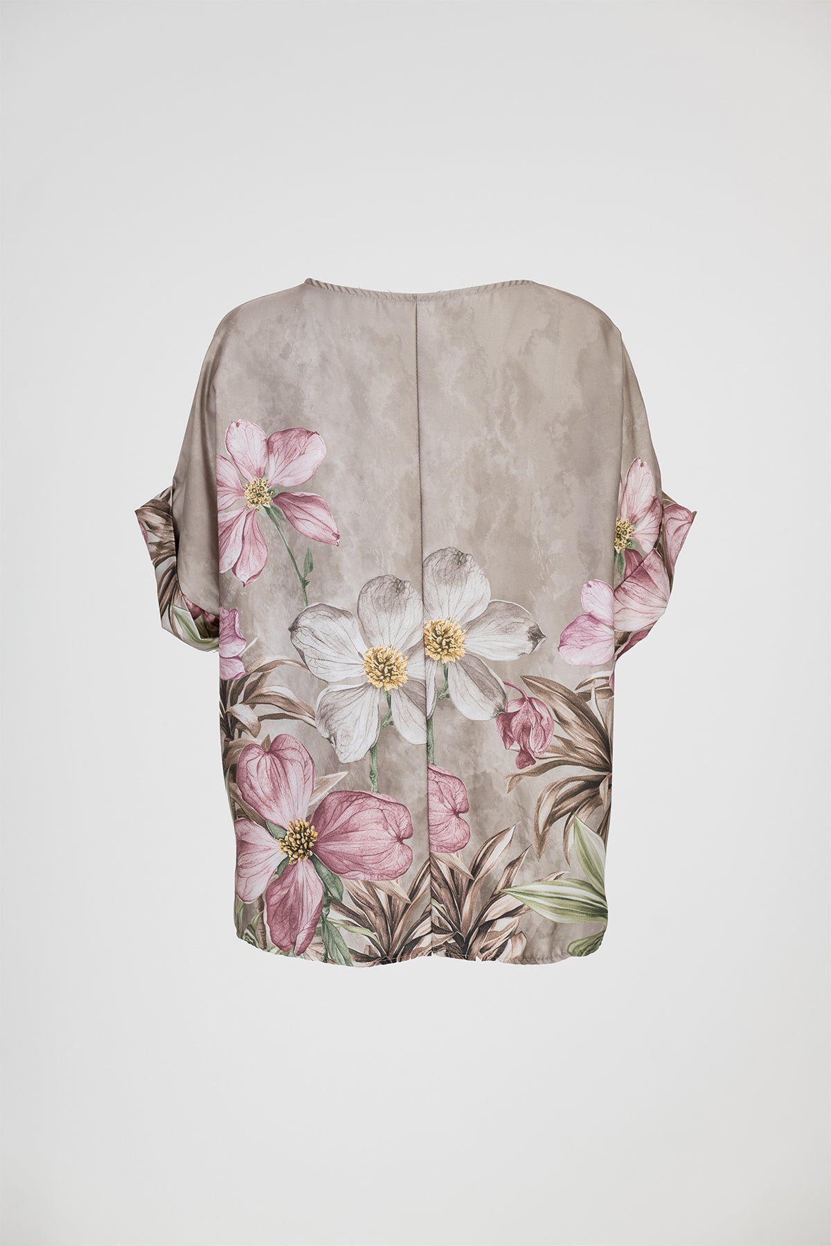 Floral Satin е дамска блуза с наситен бежов фон и изразителен флорален принт, който създава свежа и запомняща се визия. Свободният силует пада леко по тялото и дава комфорт при носене през целия ден.