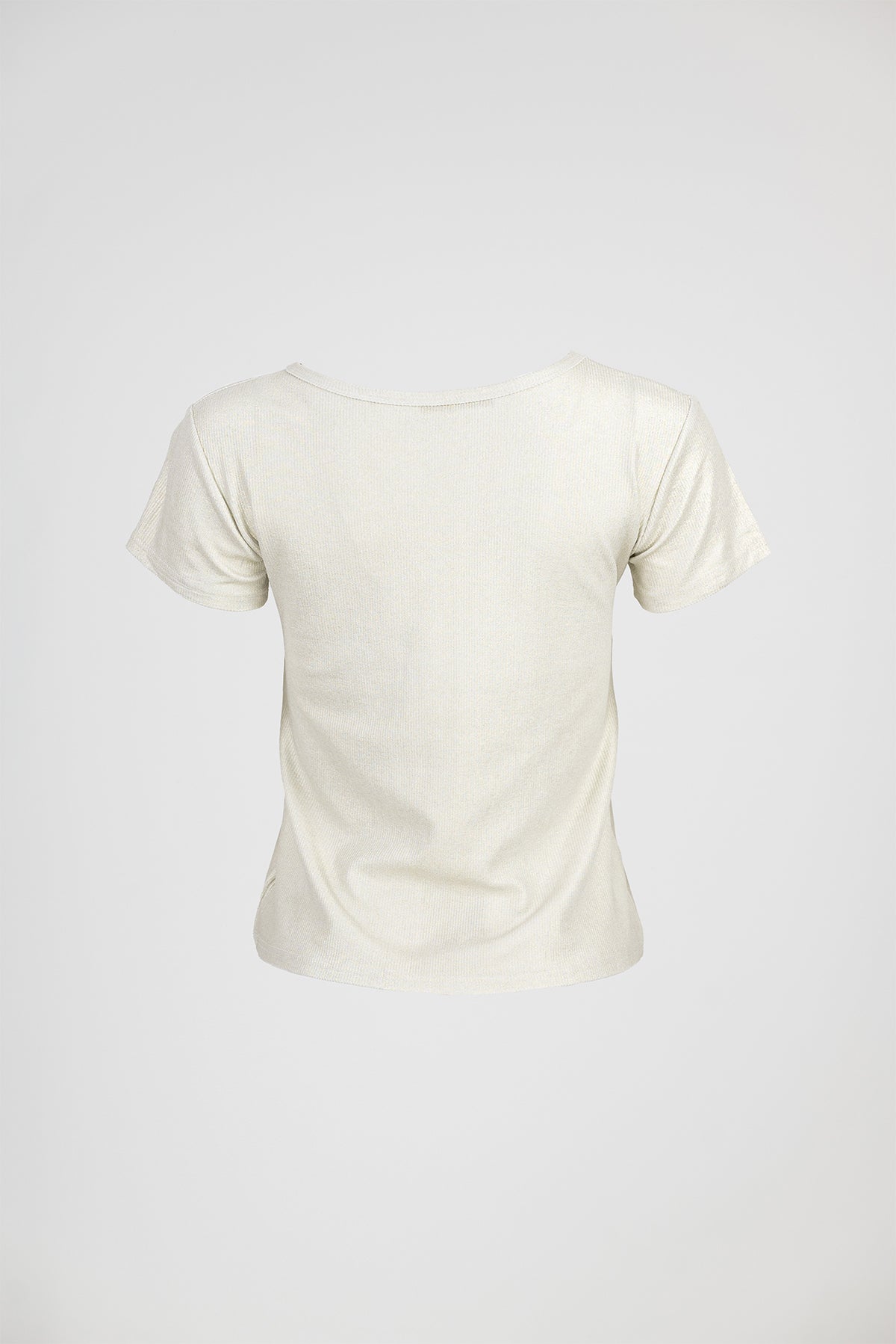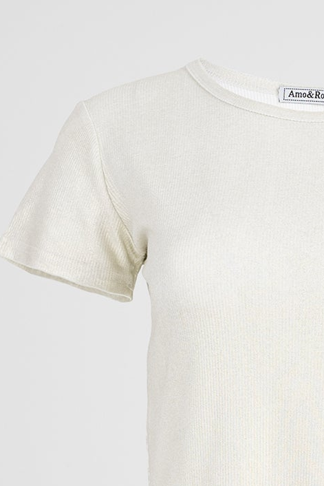 Touch е златиста дамска тениска с къс ръкав, която стои леко и женствено. Материята 95% вискоза и 5% еластан дава мек допир, гладък пад и еластичност, която следва тялото без стягане. Фината текстура прави модела подходящ за ежедневие или офис (под сако).