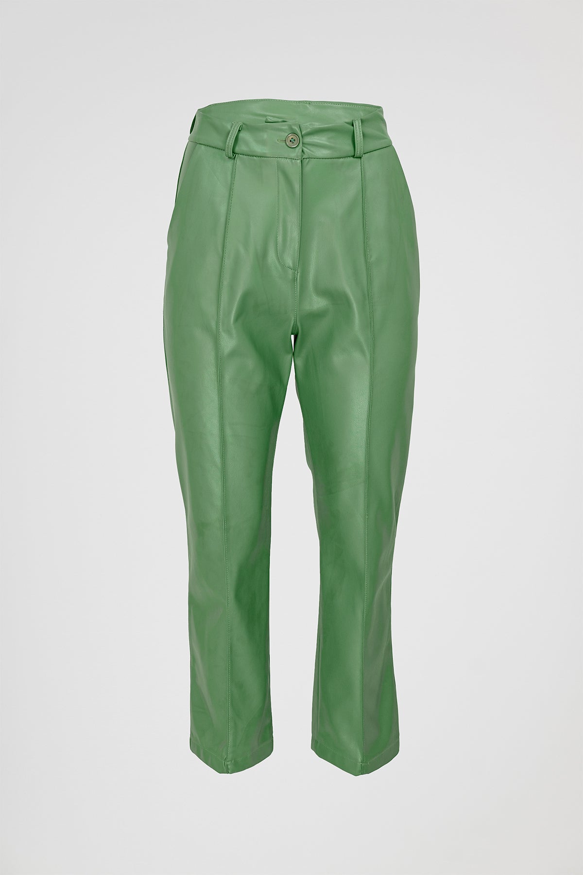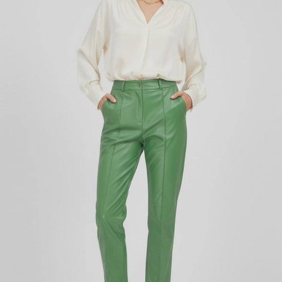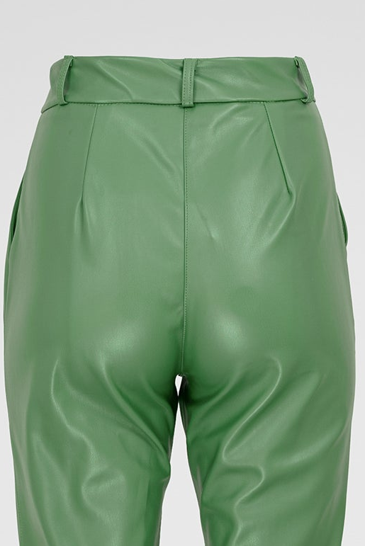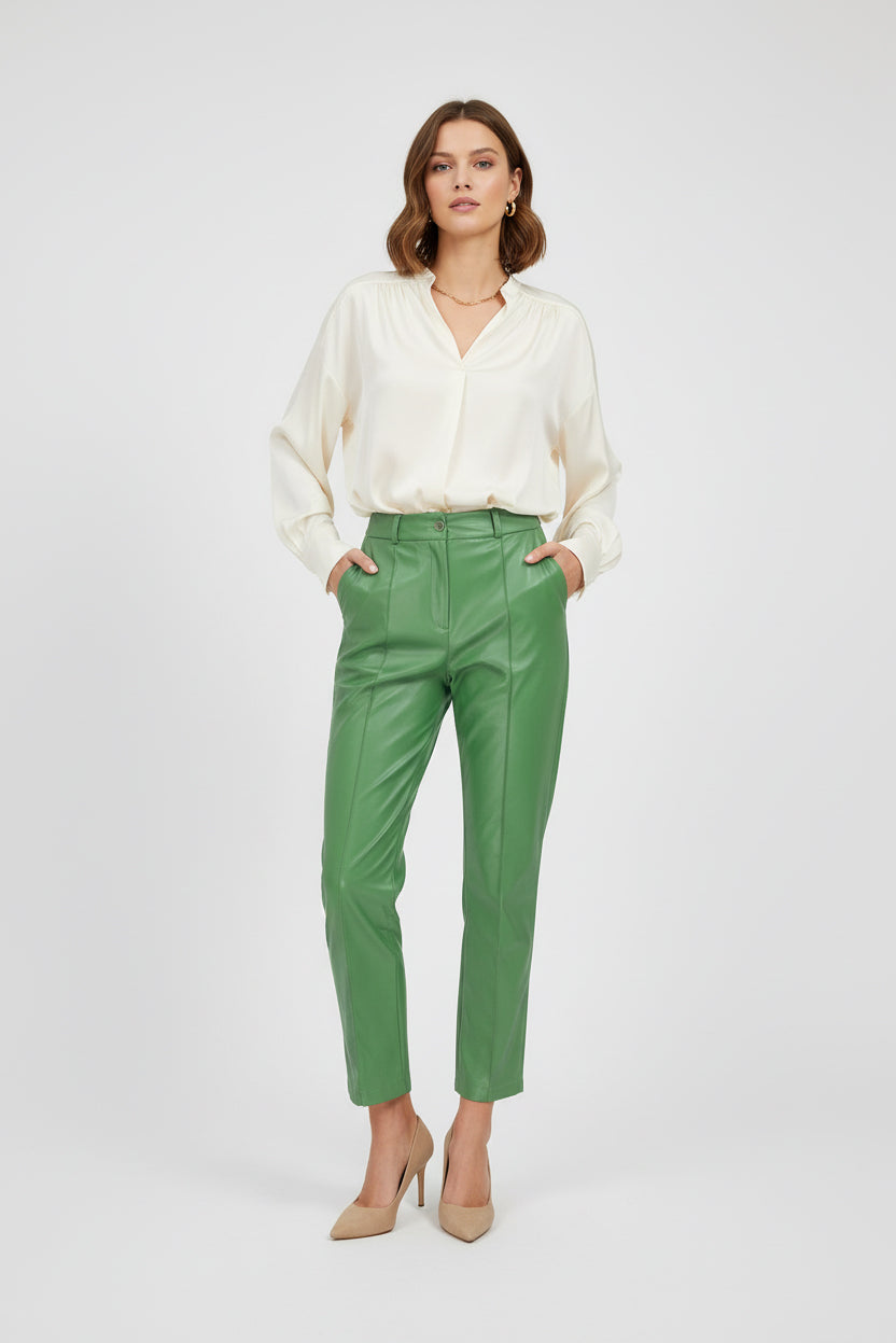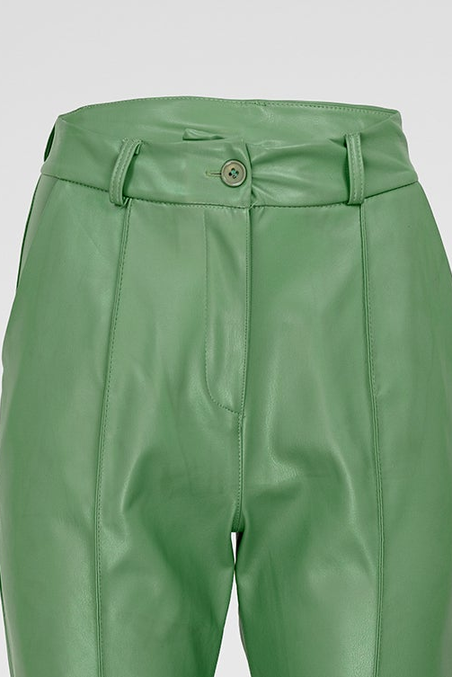 Green Edge са дамски панталони от изкуствена кожа в наситено зелено, създадени за силно и уверено присъствие. Моделът е с изчистена линия и леко разкрояване надолу, което визуално издължава крака и балансира силуета.