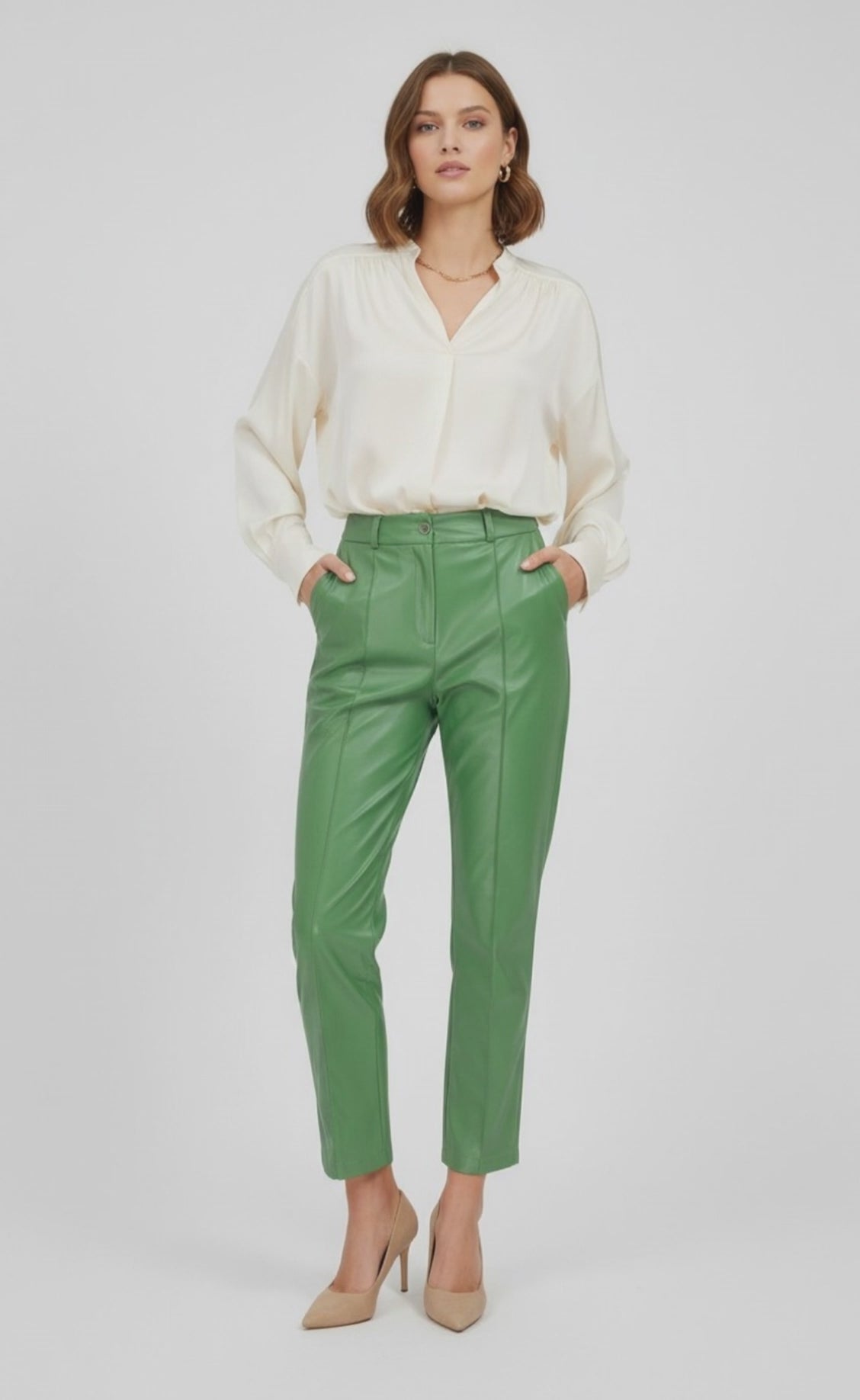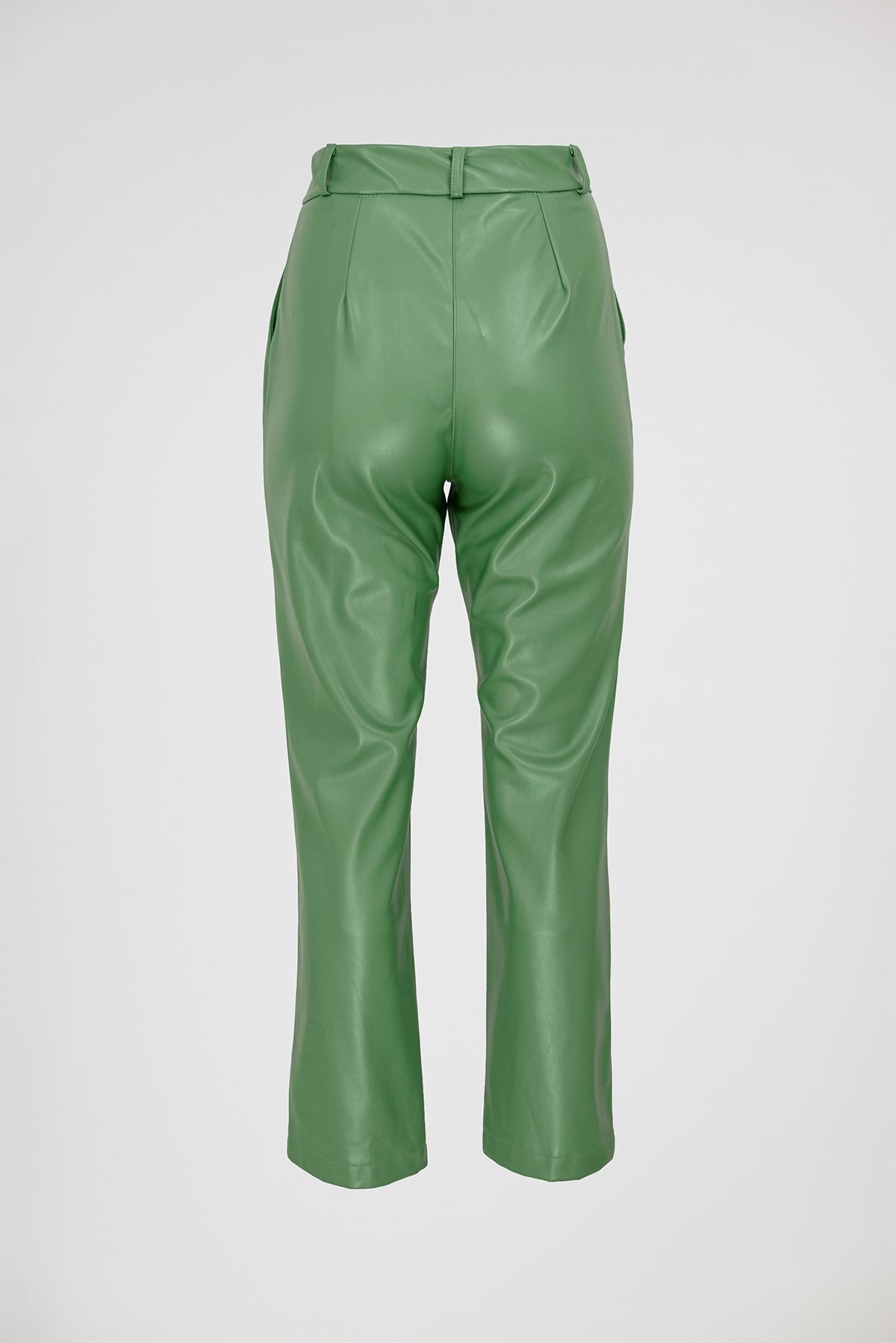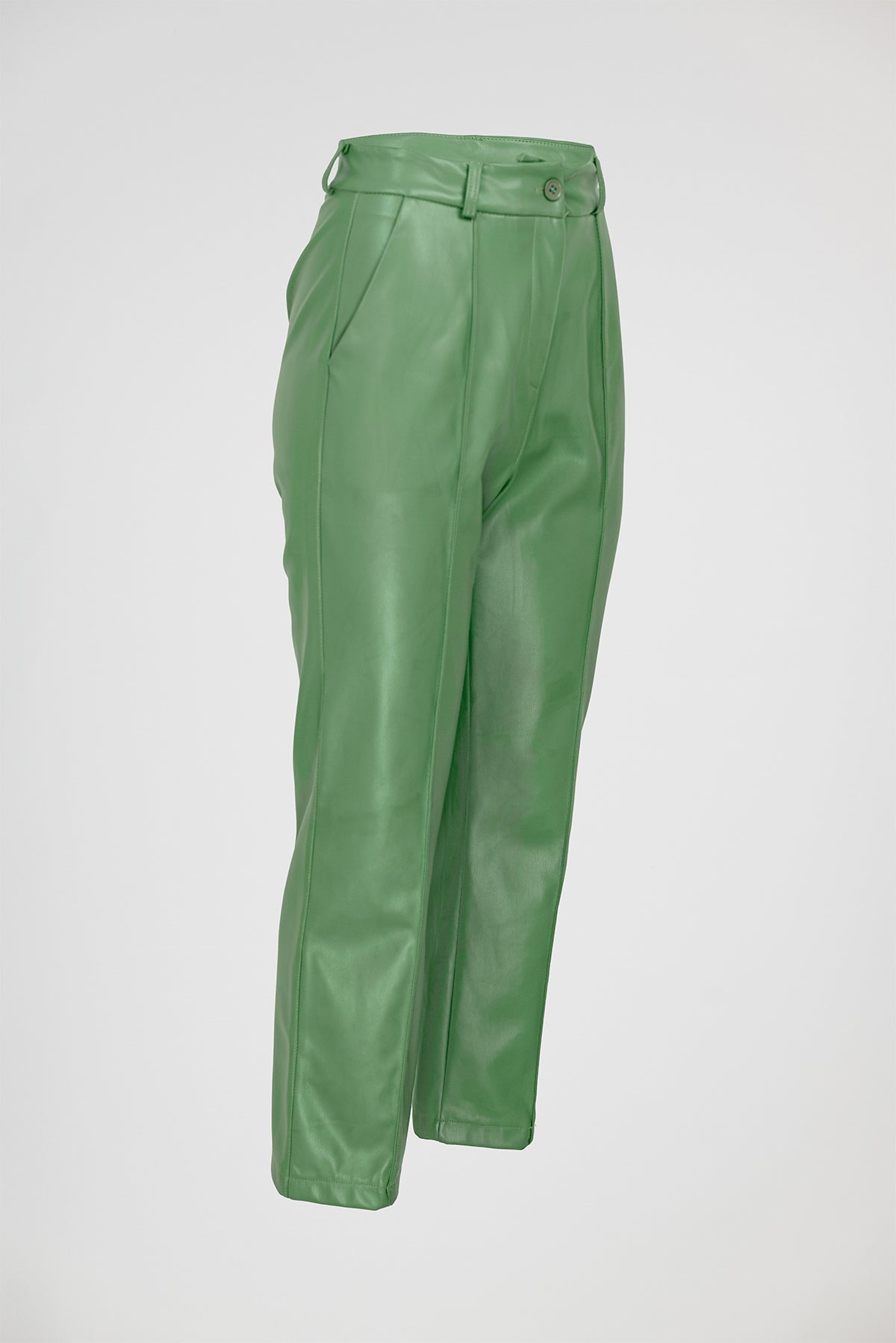 Green Edge са дамски панталони от изкуствена кожа в наситено зелено, създадени за силно и уверено присъствие. Моделът е с изчистена линия и леко разкрояване надолу, което визуално издължава крака и балансира силуета.