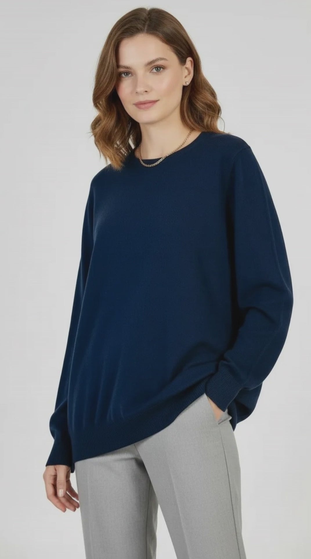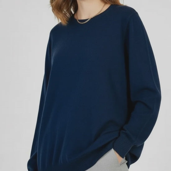 Essential Soft е мек тъмносин пуловер от фино плетиво с чист силует и обло деколте. Еластичната смес с вискоза и модал стои гладко върху тялото и е удобна за целодневно носене. Рипсените кантове на ръкавите и подгъва завършват изчистената линия – идеален самостоятелно или под сако и палто.