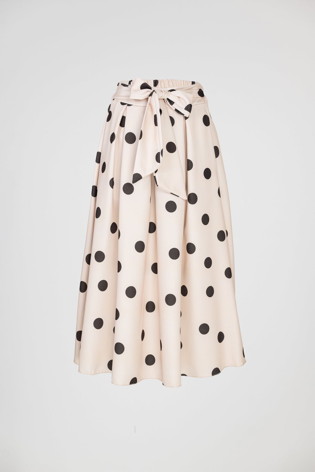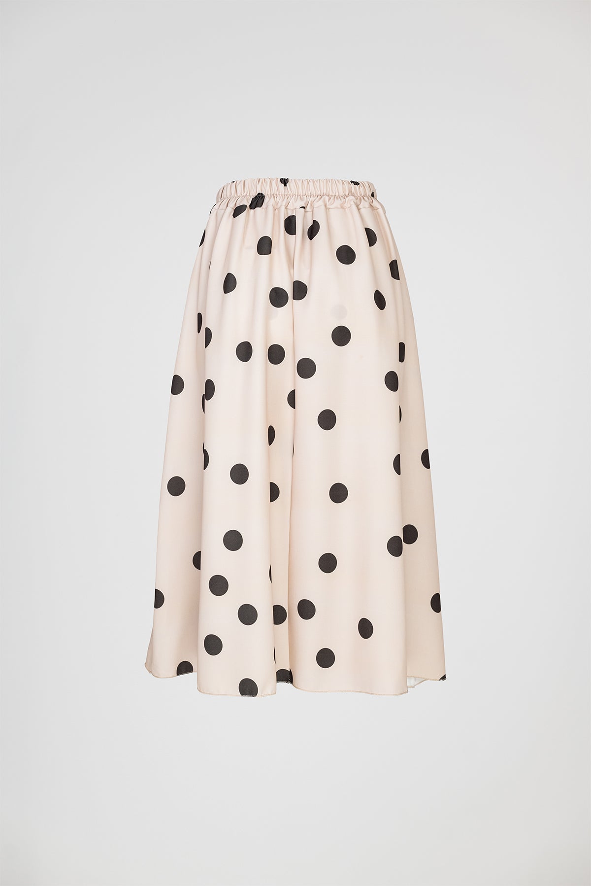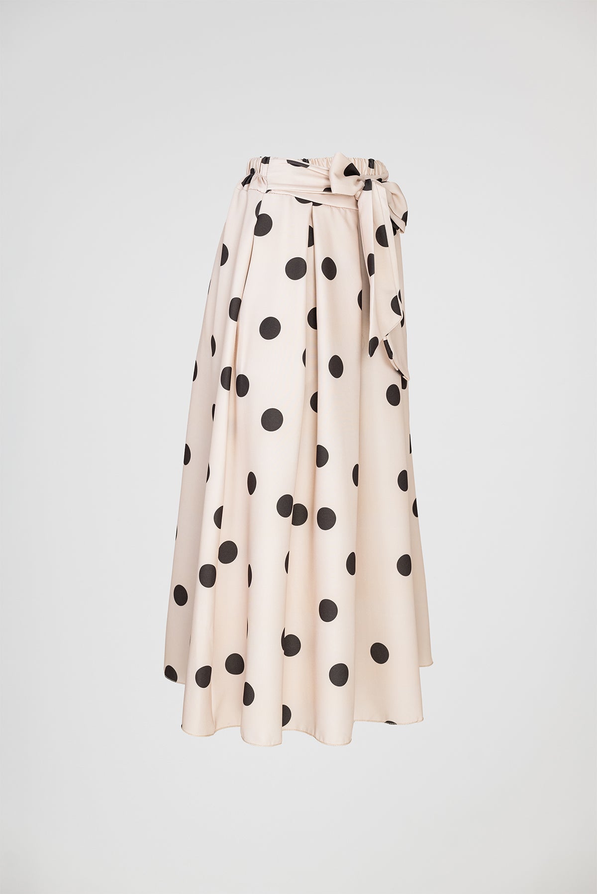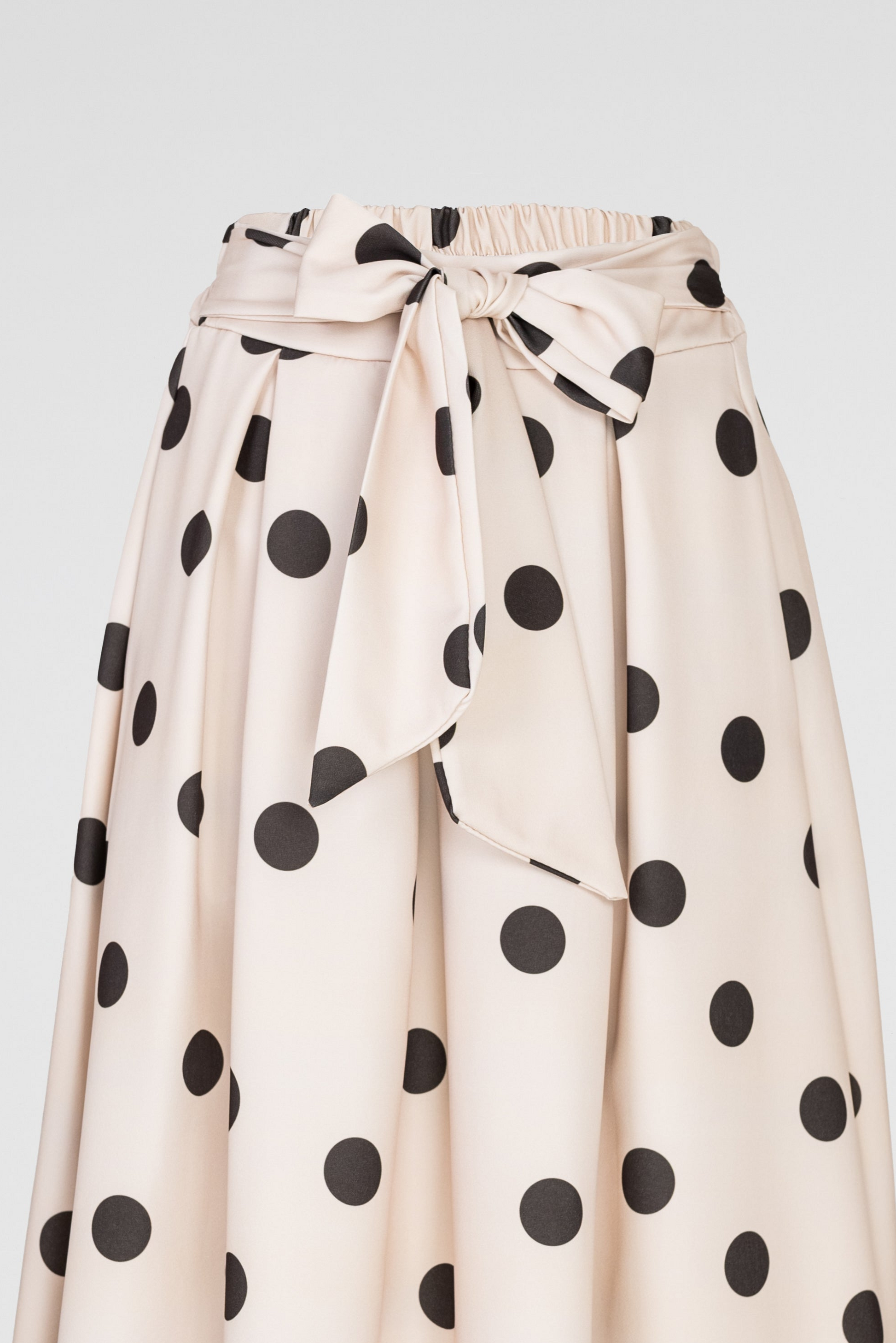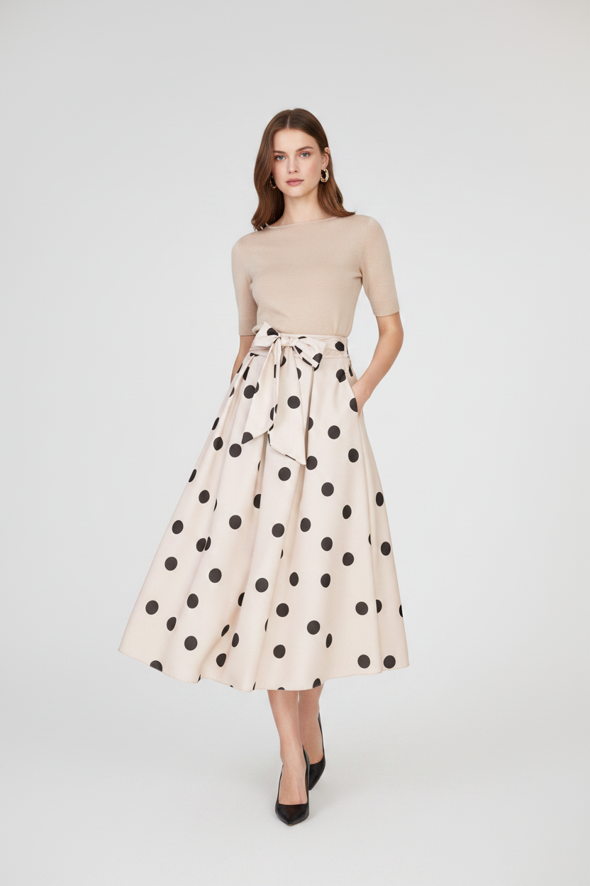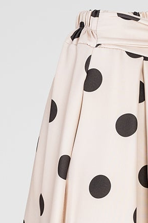 Marina Dot е бежова пола на кафеви точки с женствена разкроена линия и колан в талията, който оформя силуета по елегантен начин. Десенът носи класическо излъчване с лек ретро акцент, а тежкото падане прави модела отличен за стилни ежедневни и по-елегантни визии.
