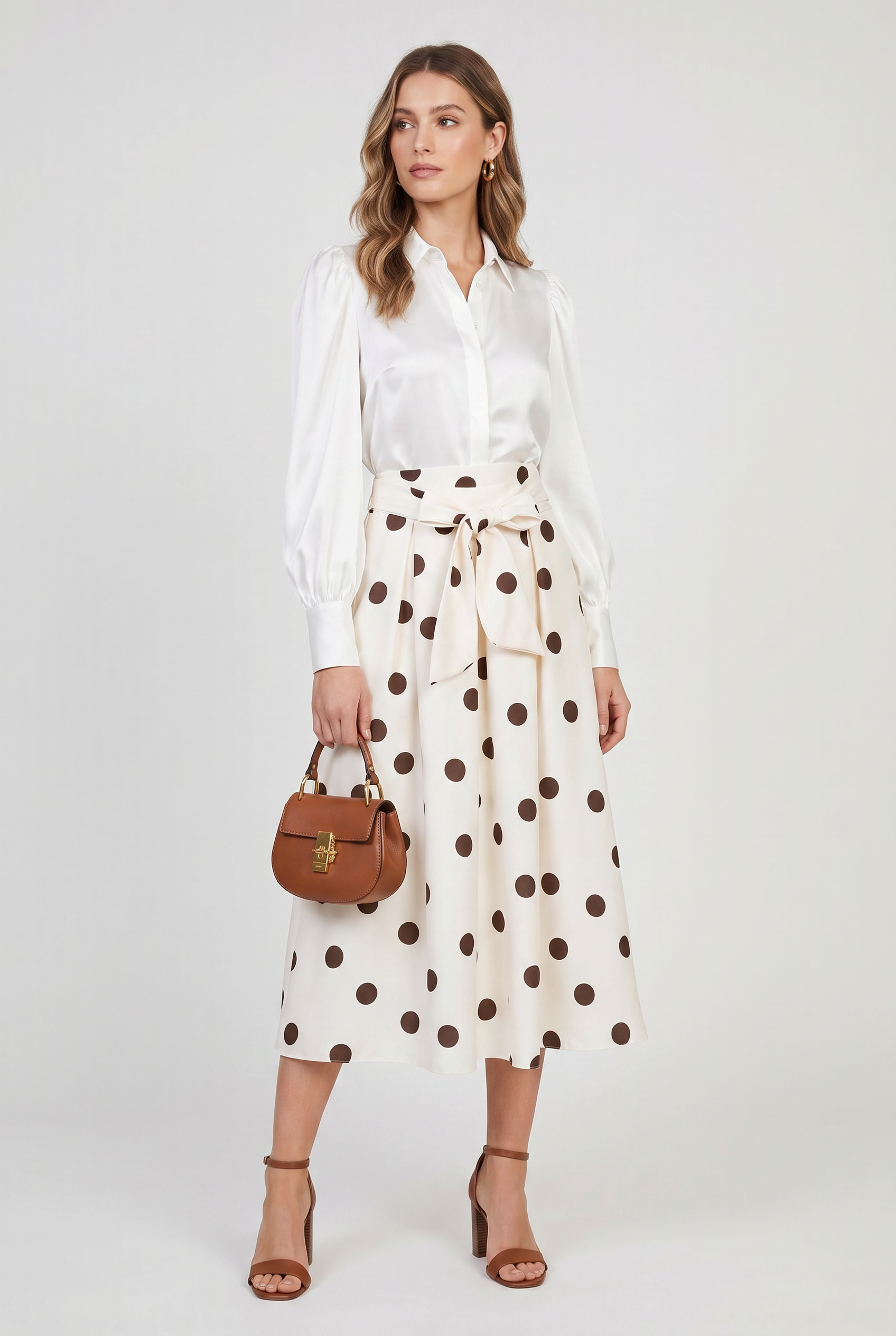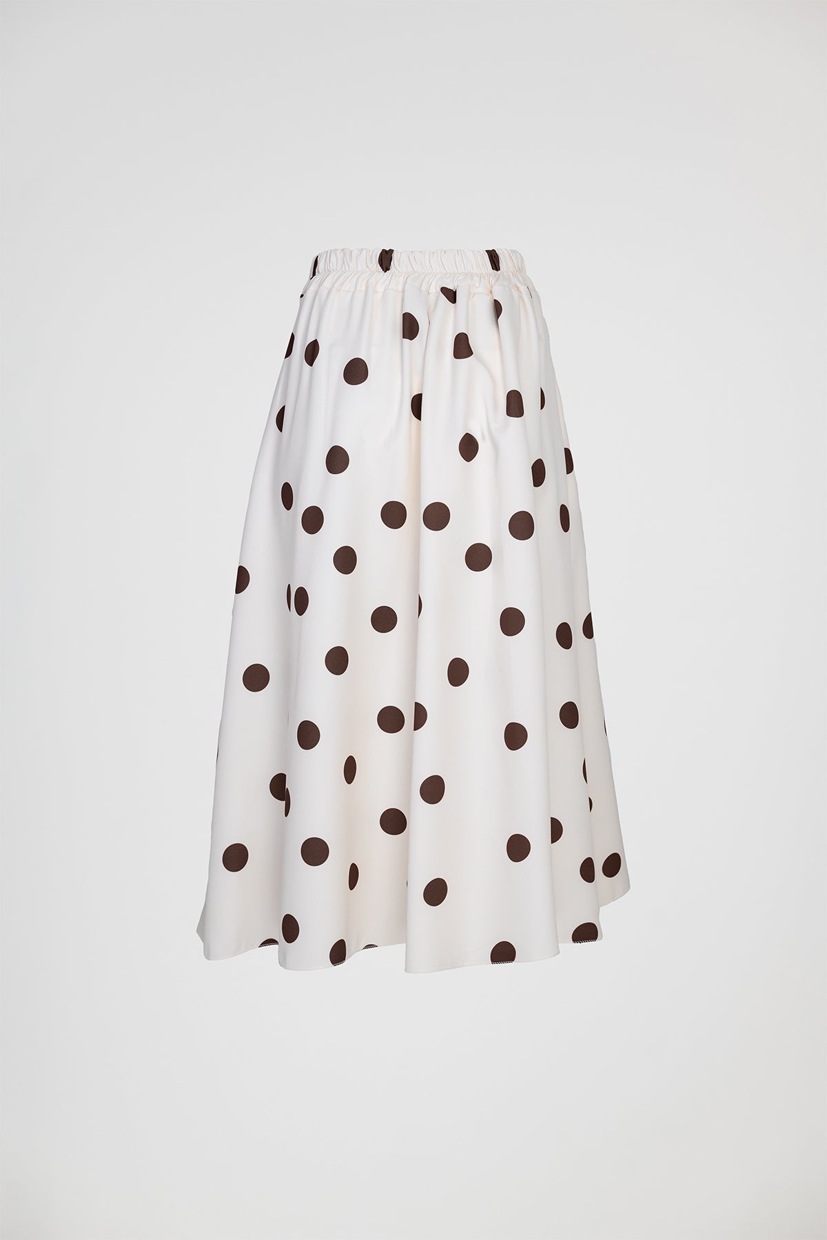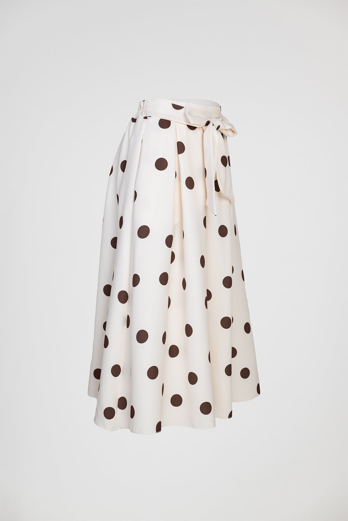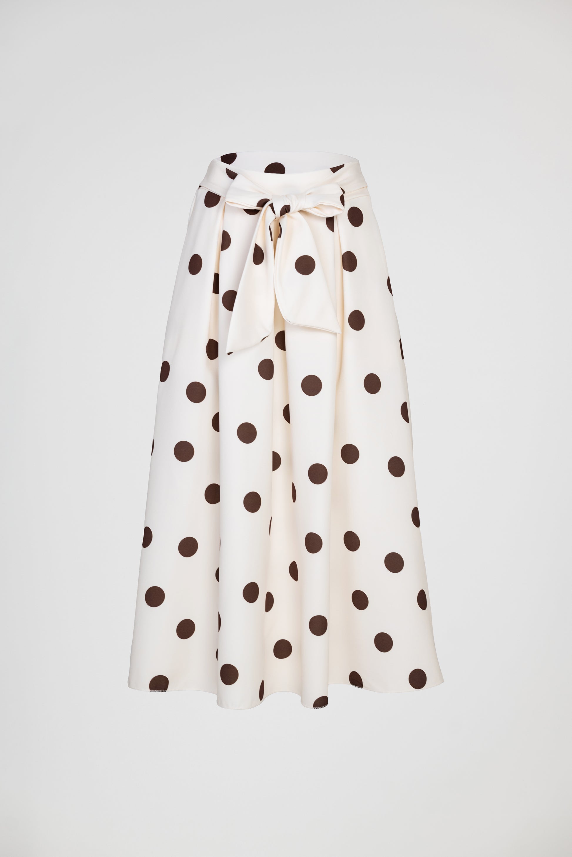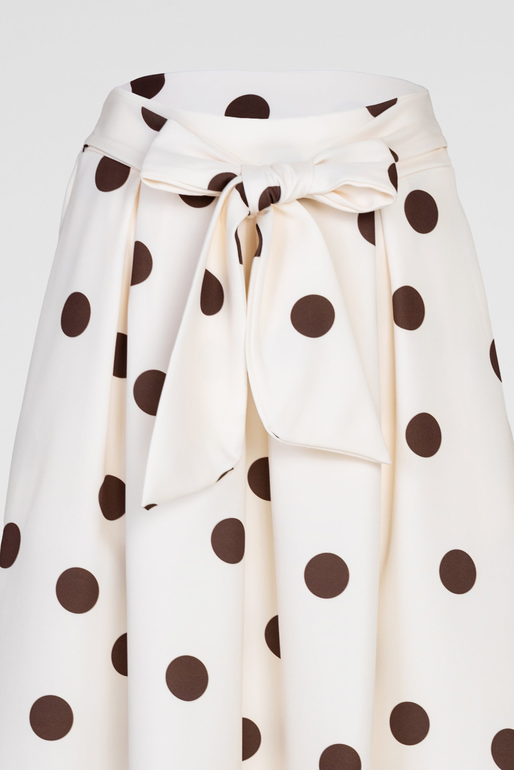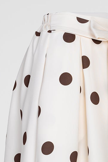 Marina Dot е екрю пола на кафеви точки с женствена разкроена линия и колан в талията, който оформя силуета по елегантен начин. Десенът носи класическо излъчване с лек ретро акцент, а тежкото падане прави модела отличен за стилни ежедневни и по-елегантни визии.