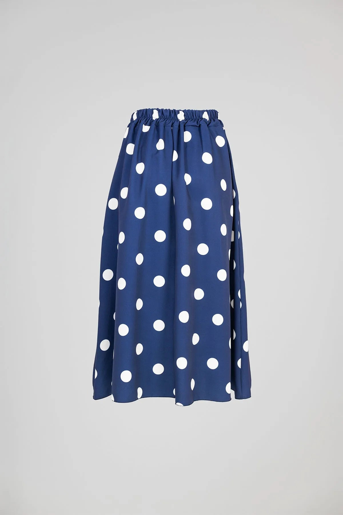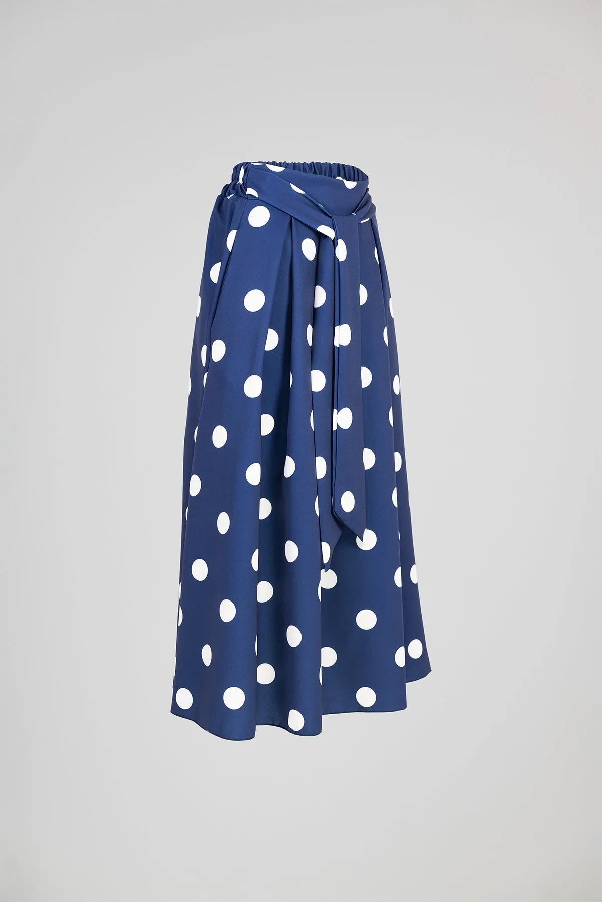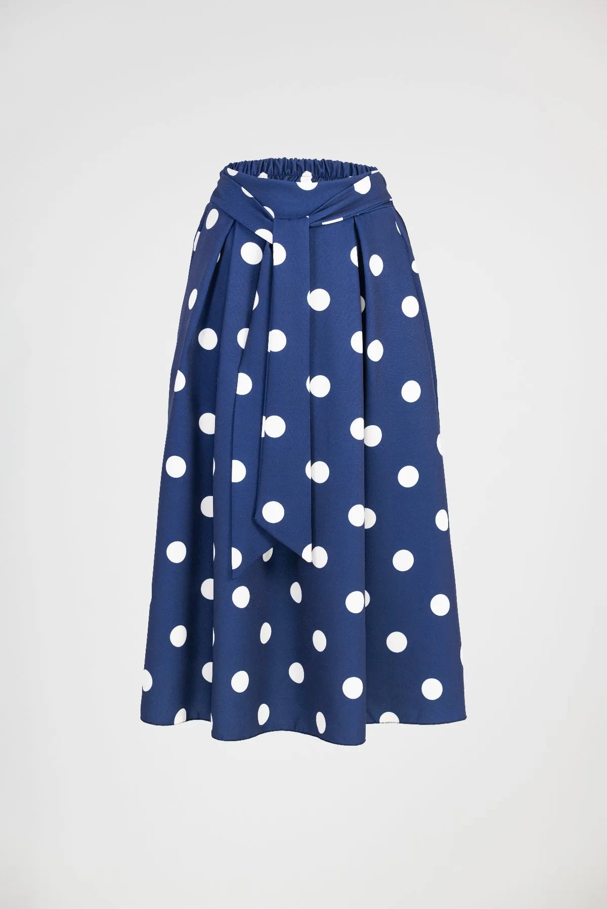 Marina Dot е синя пола на бели точки с женствена разкроена линия и колан в талията, който оформя силуета по елегантен начин. Десенът носи класическо излъчване с лек ретро акцент, а свободното падане прави модела отличен за стилни ежедневни и по-елегантни визии.