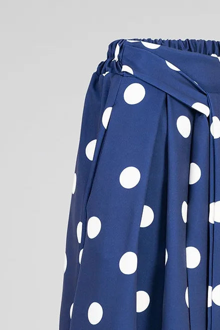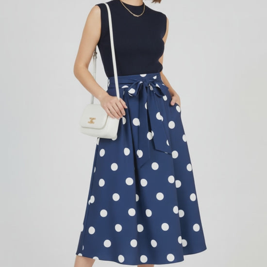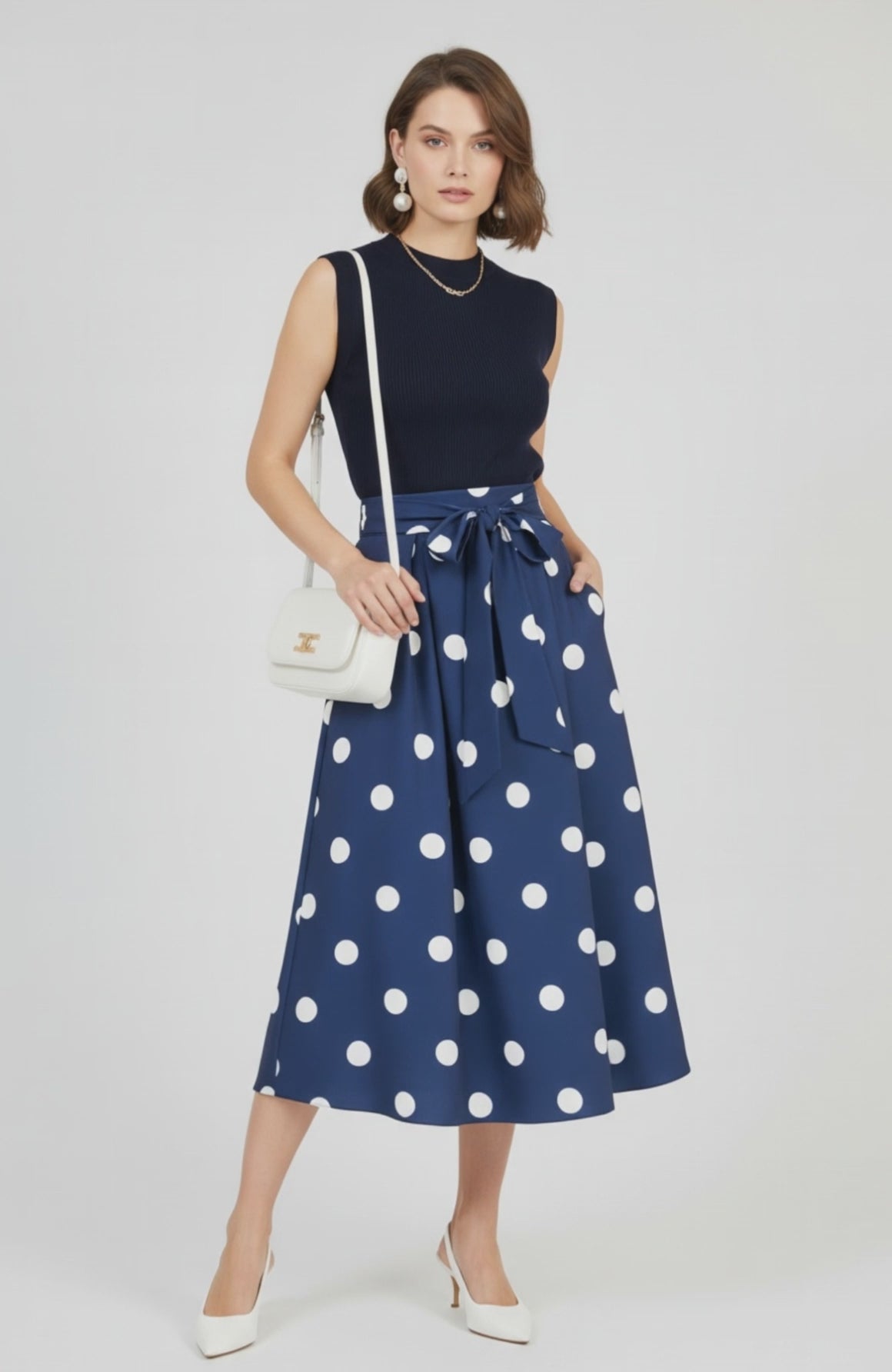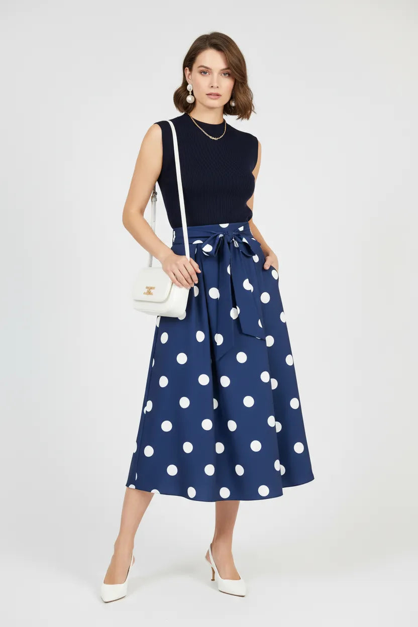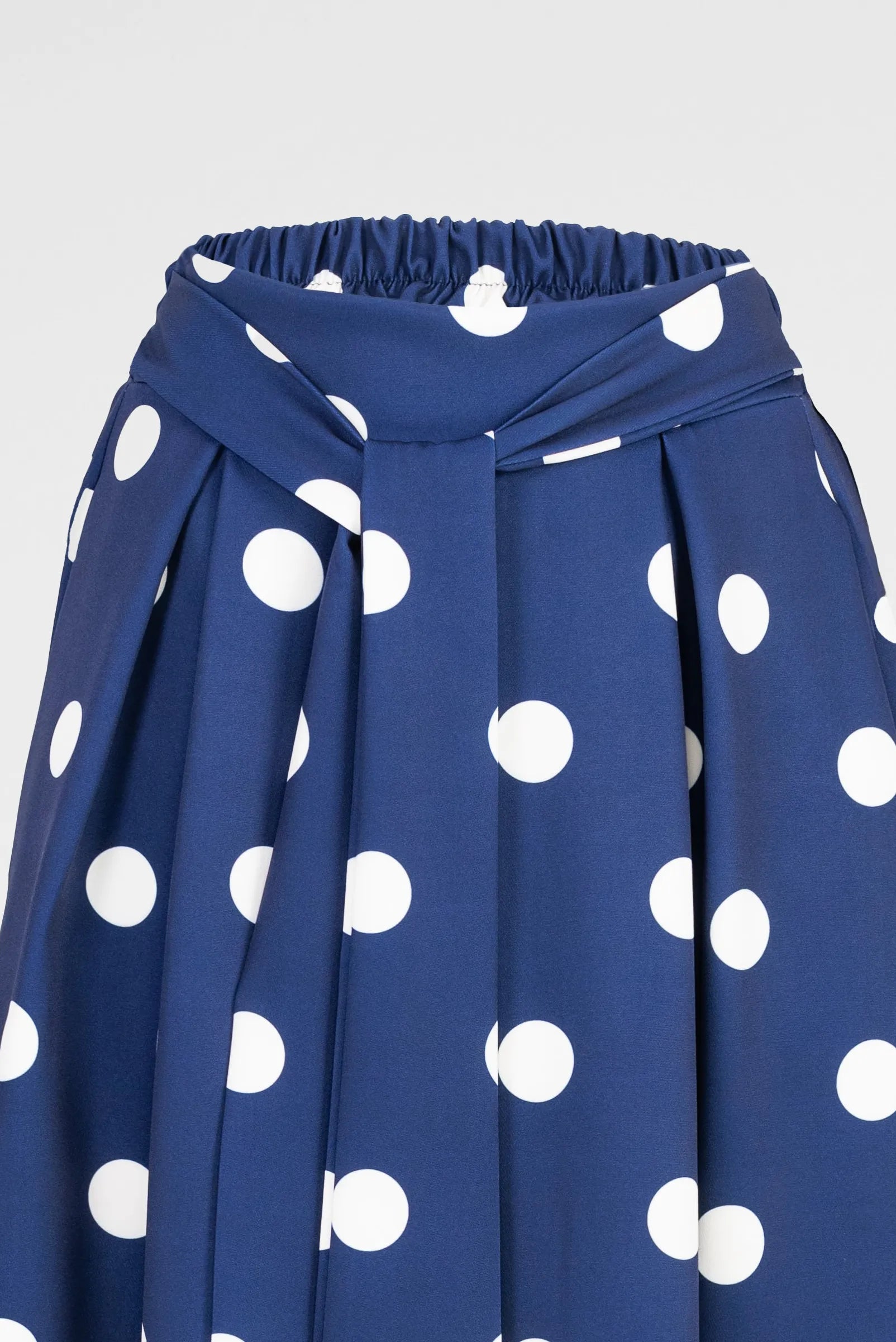Marina Dot е синя пола на бели точки с женствена разкроена линия и колан в талията, който оформя силуета по елегантен начин. Десенът носи класическо излъчване с лек ретро акцент, а свободното падане прави модела отличен за стилни ежедневни и по-елегантни визии.