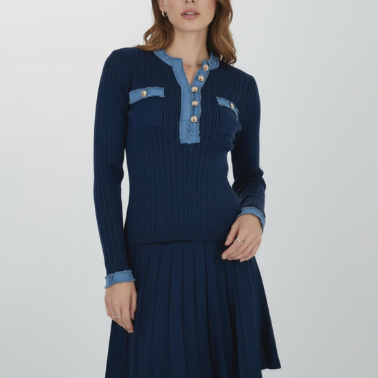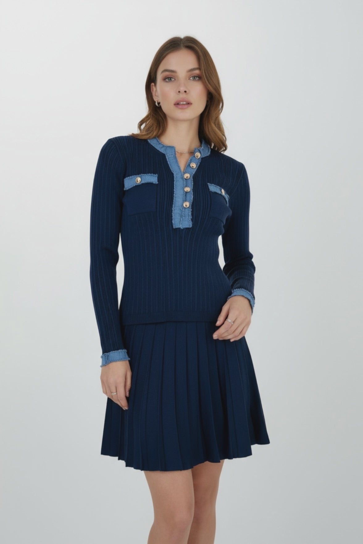 Елегантен дамски плетен комплект в тъмносиньо: рипсена блуза с деним кант и декоративни златисти копчета + плисирана пола с прецизна линия. Еластичната плетка приляга чисто, без да стяга. Универсален размер – отговаря до M.