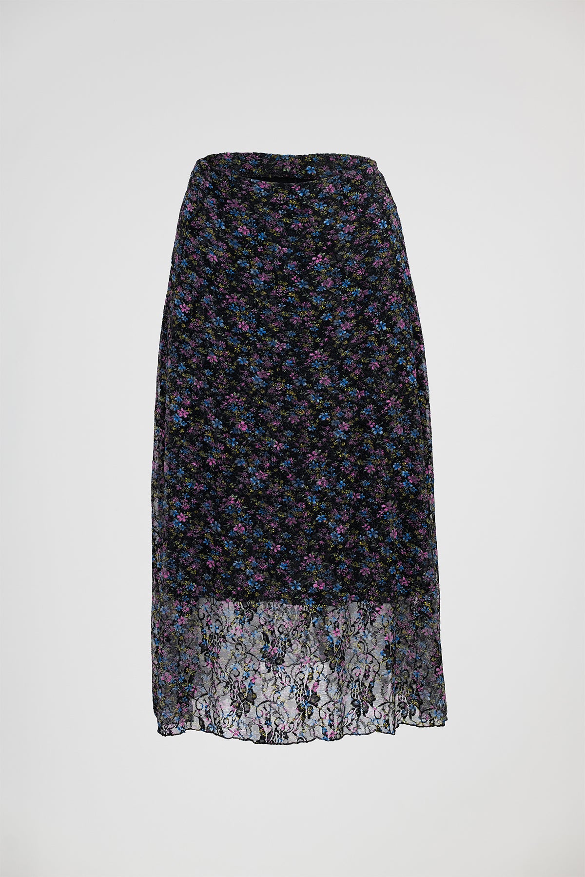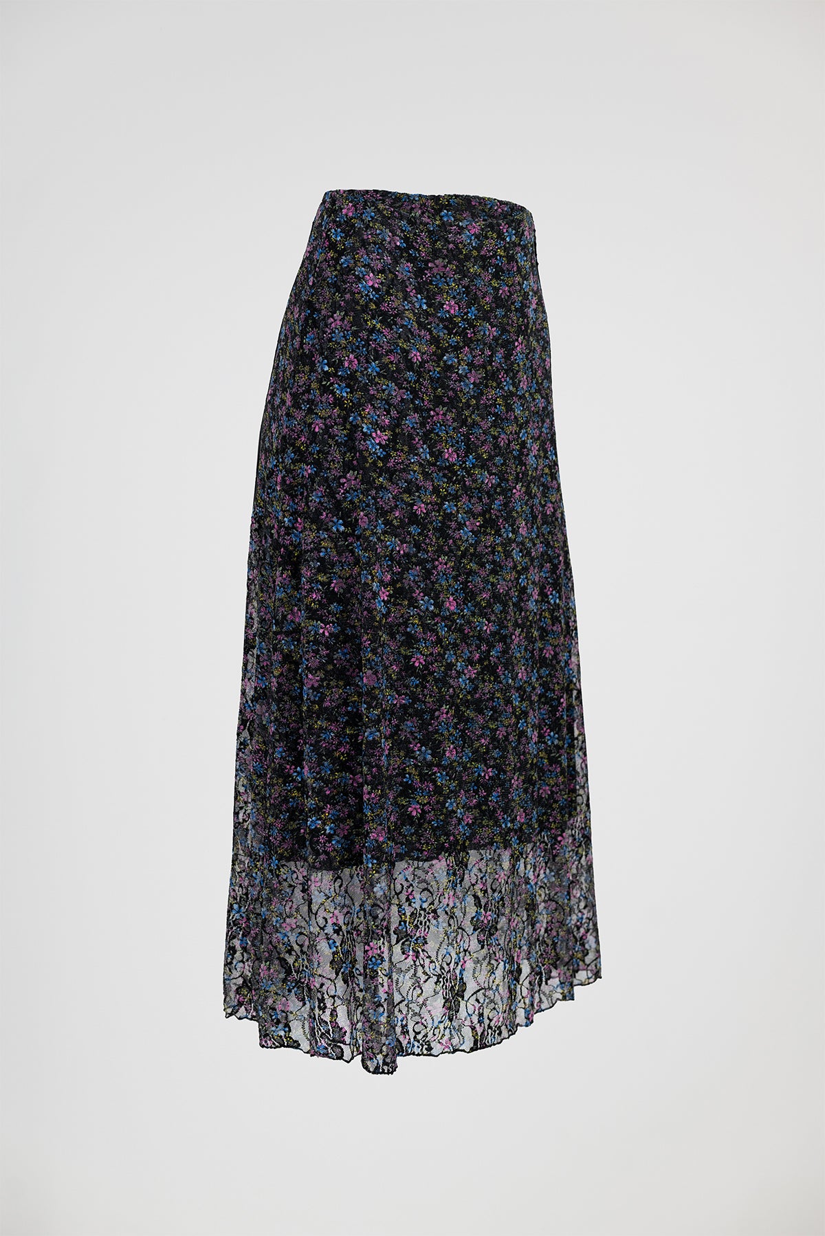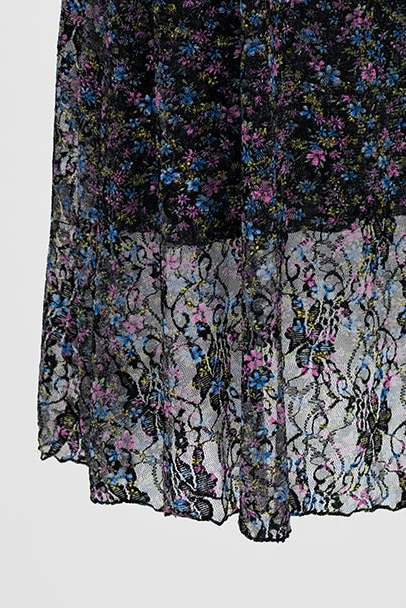 Midnight Flower е миди пола с черна основа и ситен цветен принт, завършена с прозрачен тюлен панел. Силуетът пада леко и прави визията по-ефирна, а полупрозрачният долен край добавя дълбочина и движение при ходене.