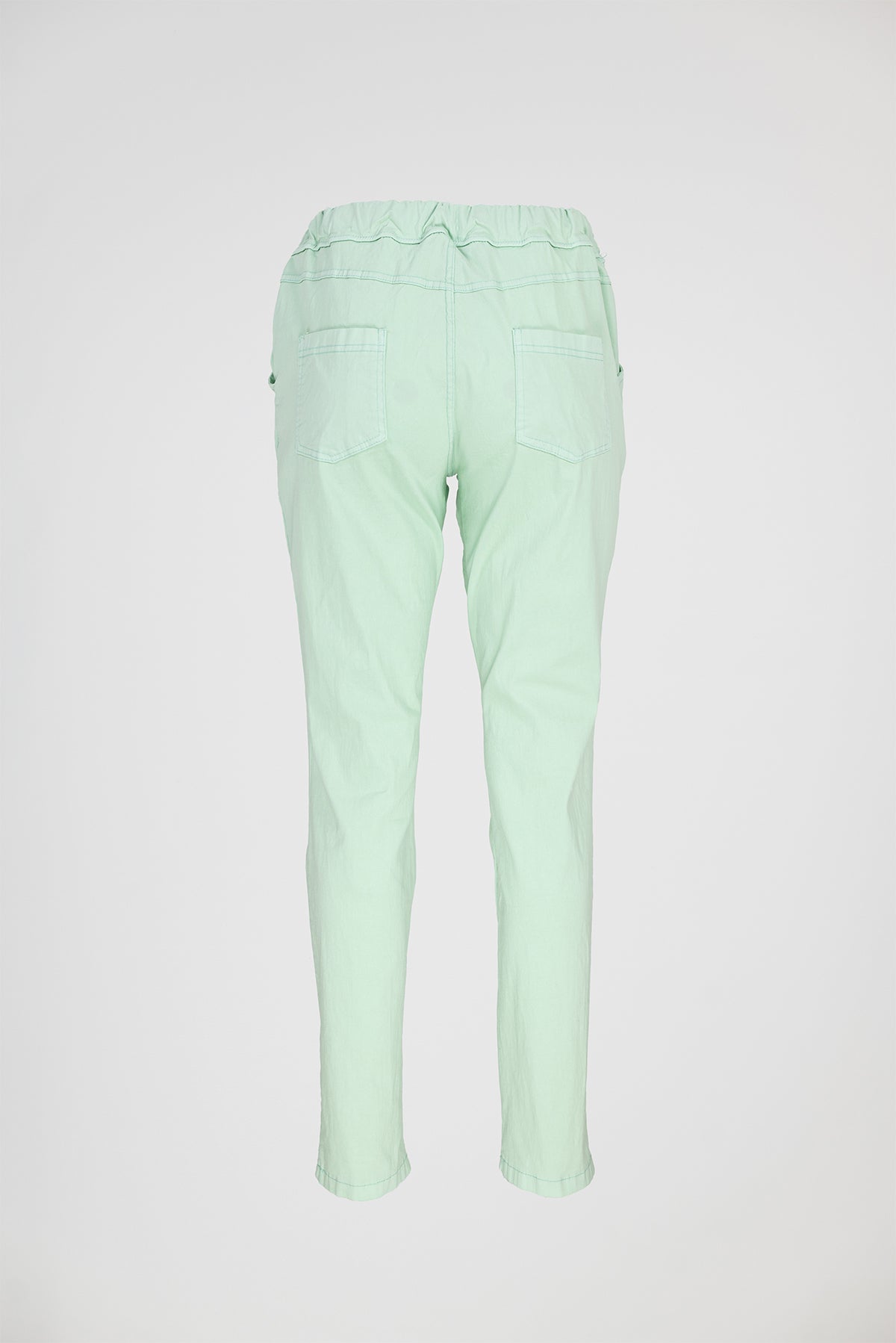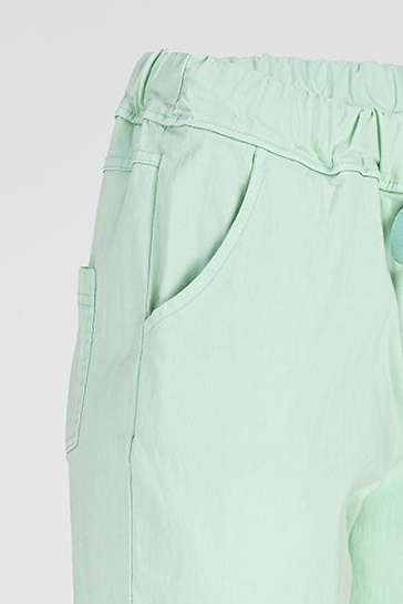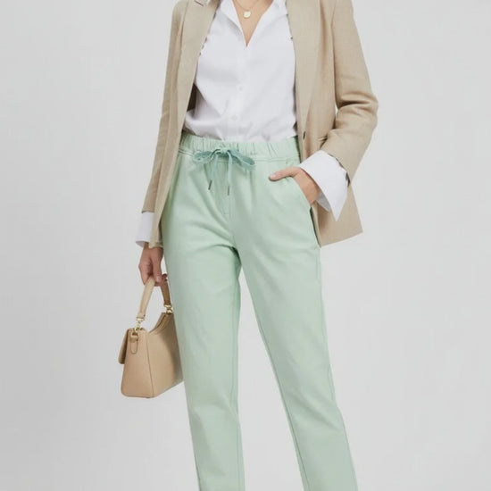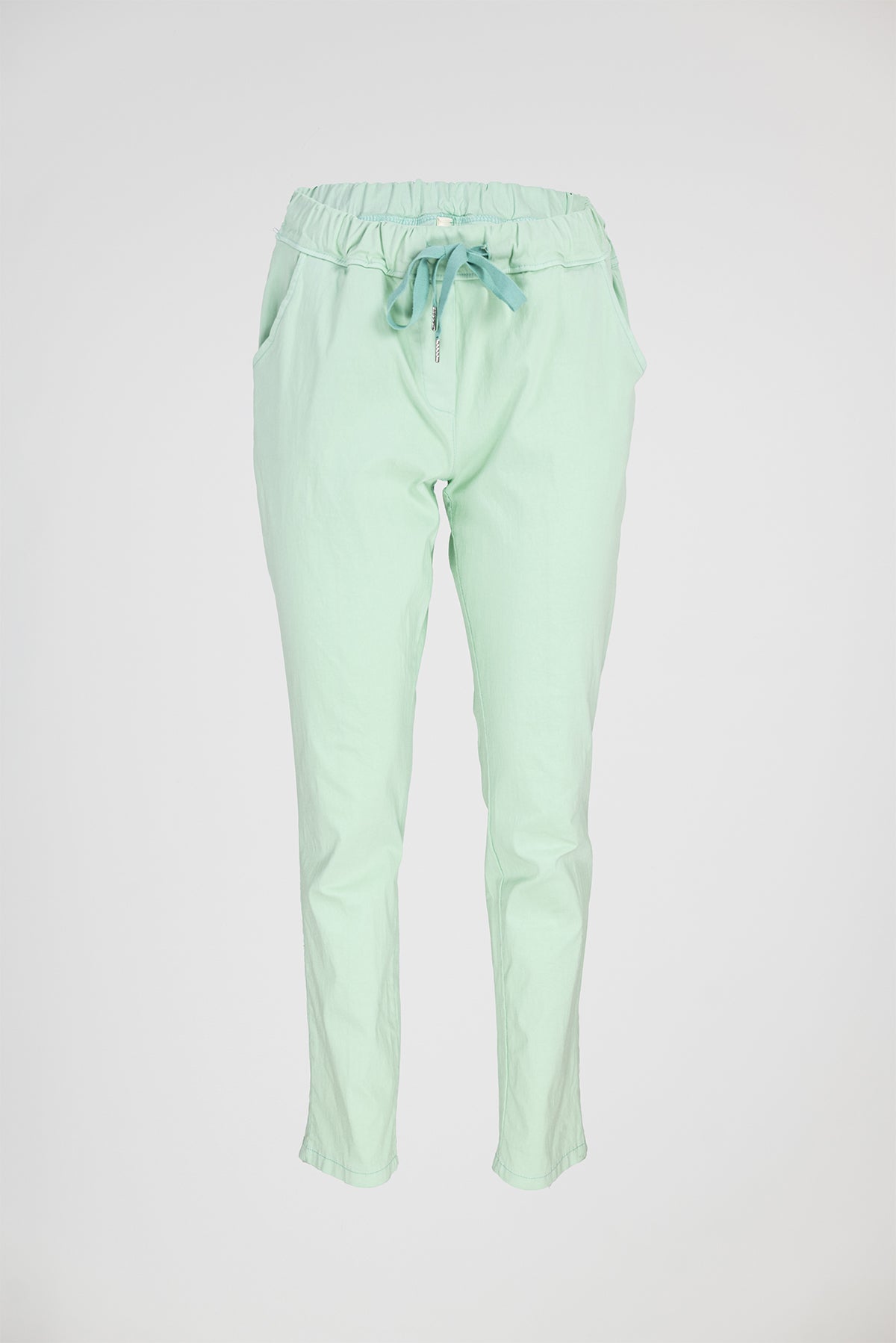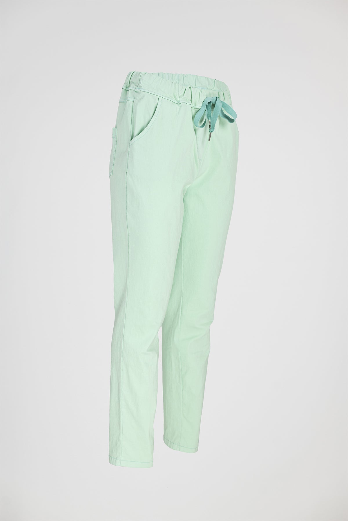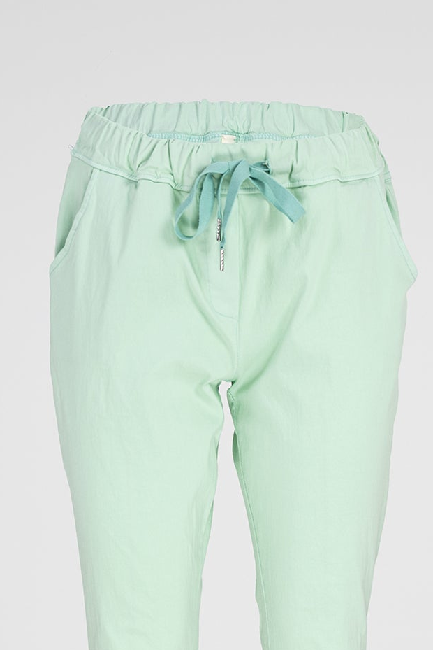 Easy е дамски панталон в мек ментов нюанс, създаден за леко и свободно усещане през целия ден. Кройката е права и изчистена, а еластичната талия с връзки осигурява комфорт без стягане и ясно оформен силует.