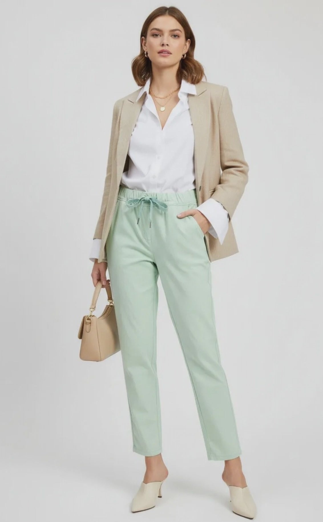 Материята от вискоза с еластан е приятна на допир, дишаща и подходяща за ежедневие, пътуване и спокойни градски визии. Цветът стои чисто и светло и се комбинира лесно с неутрални и пастелни тонове.