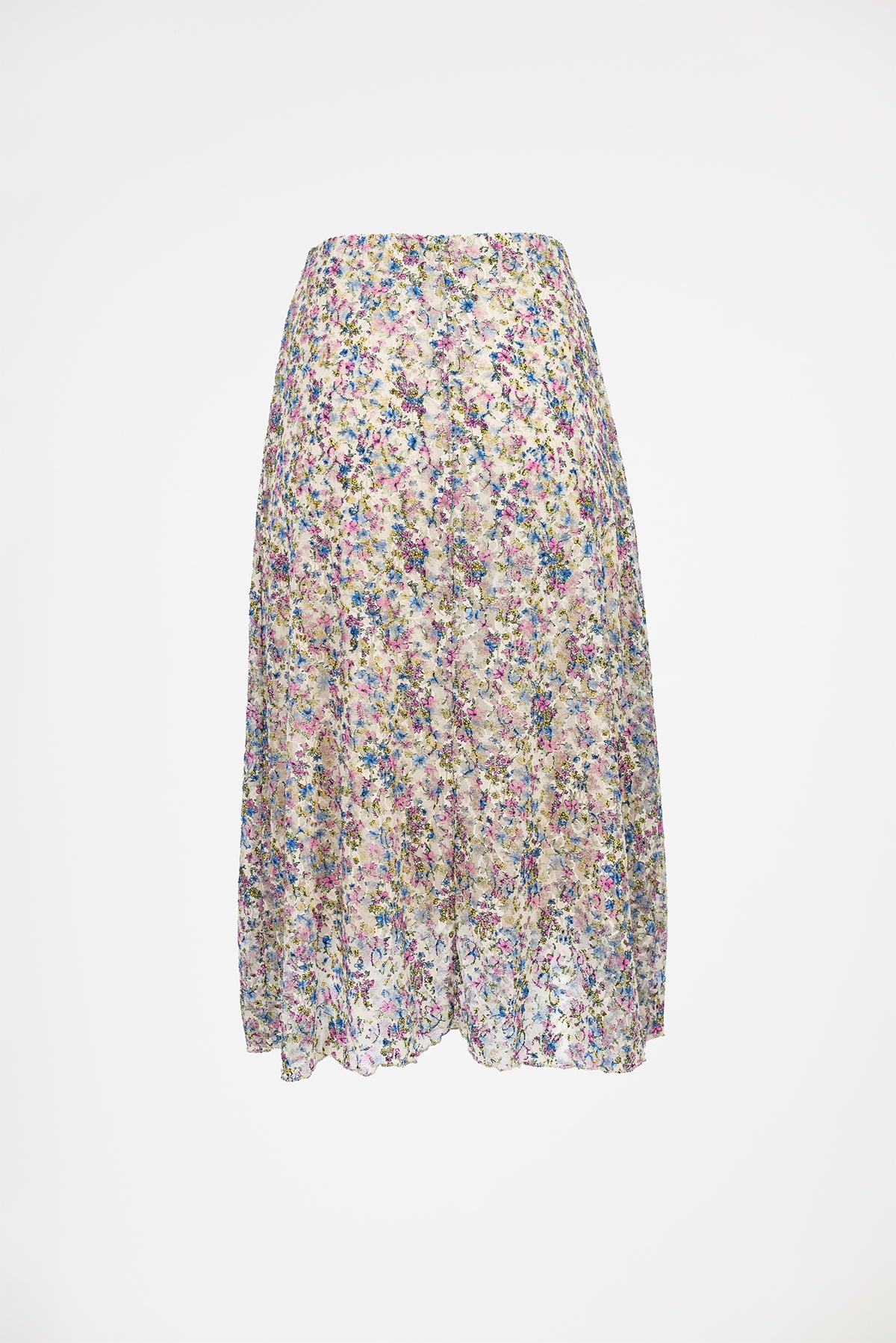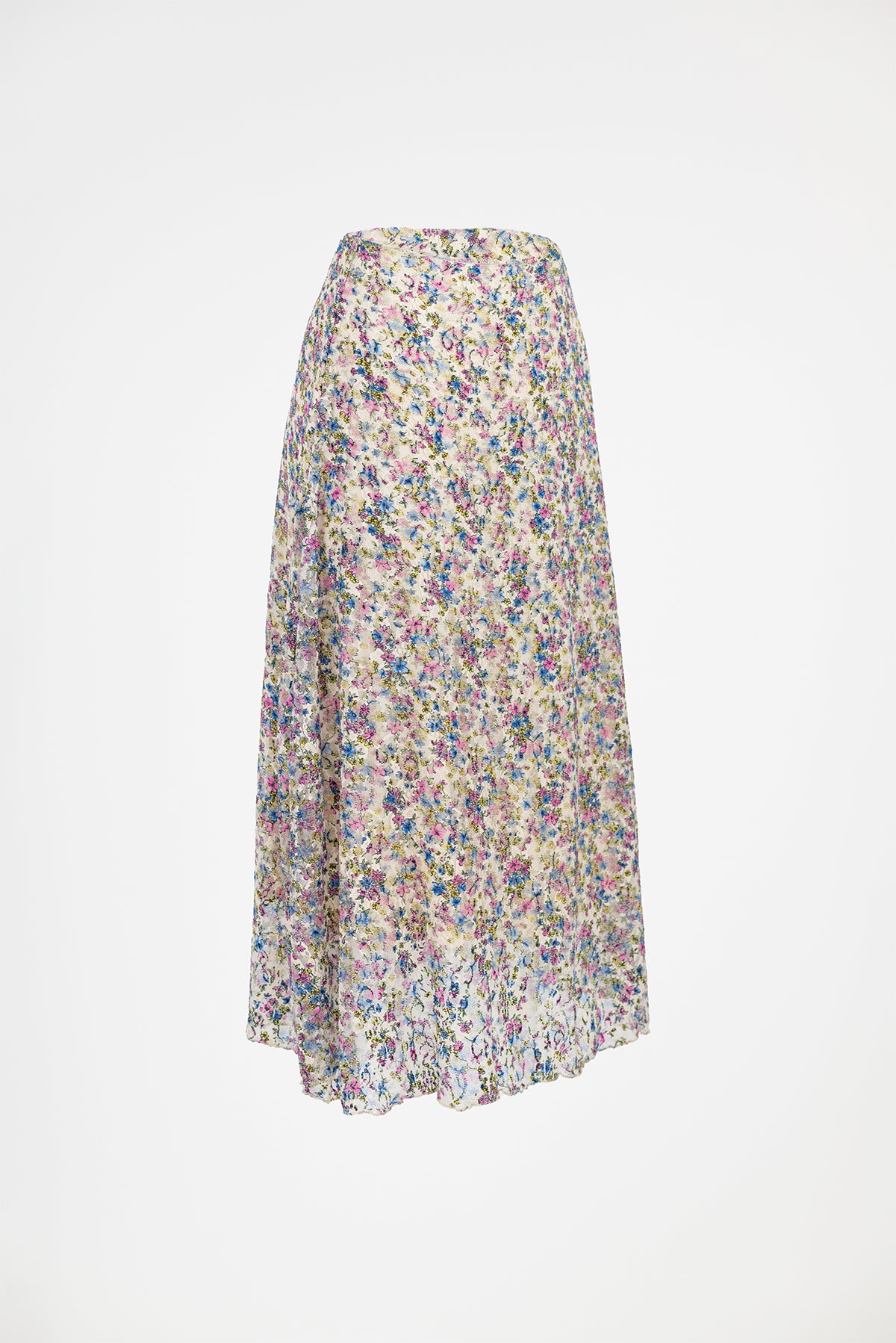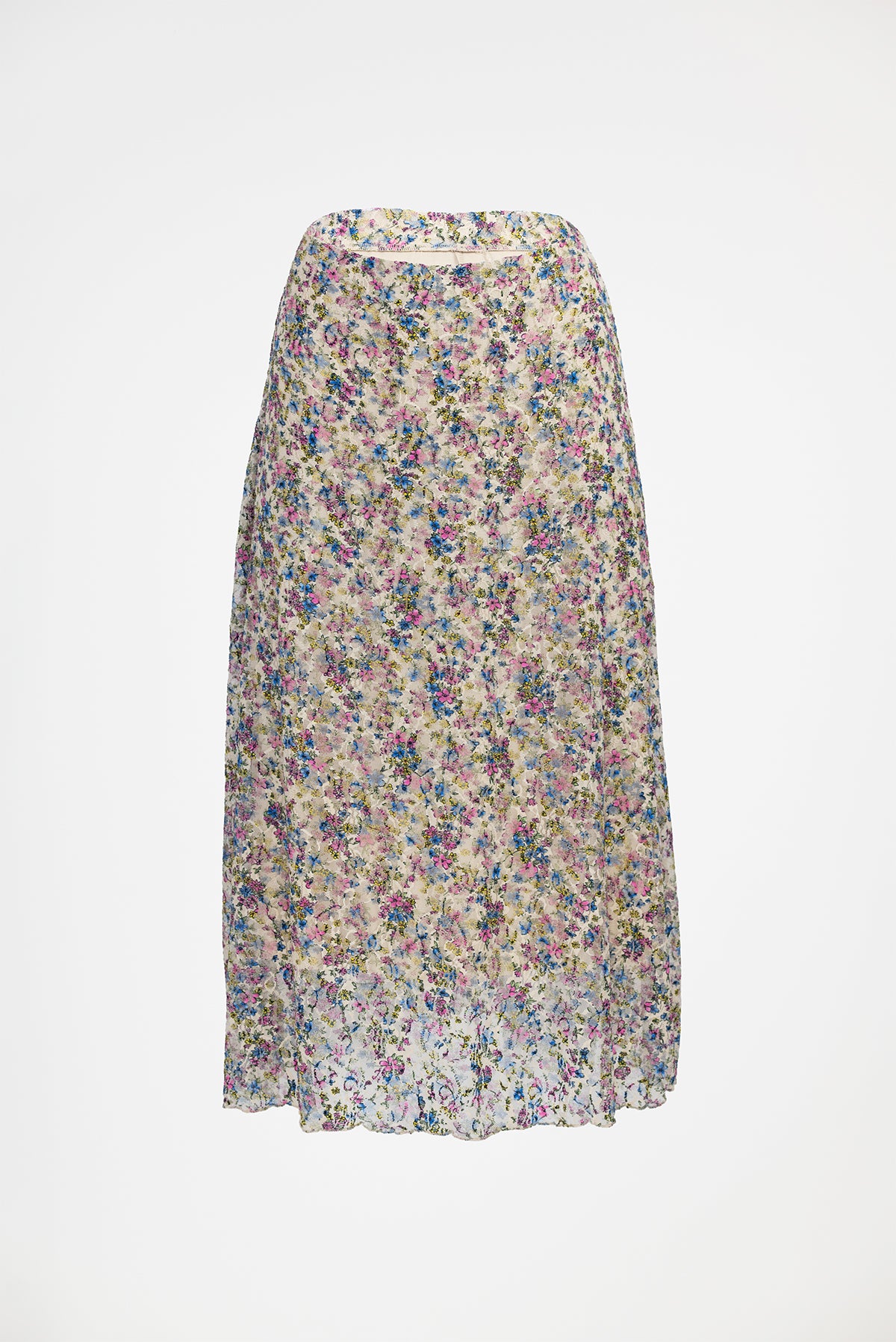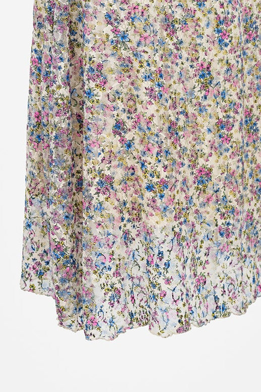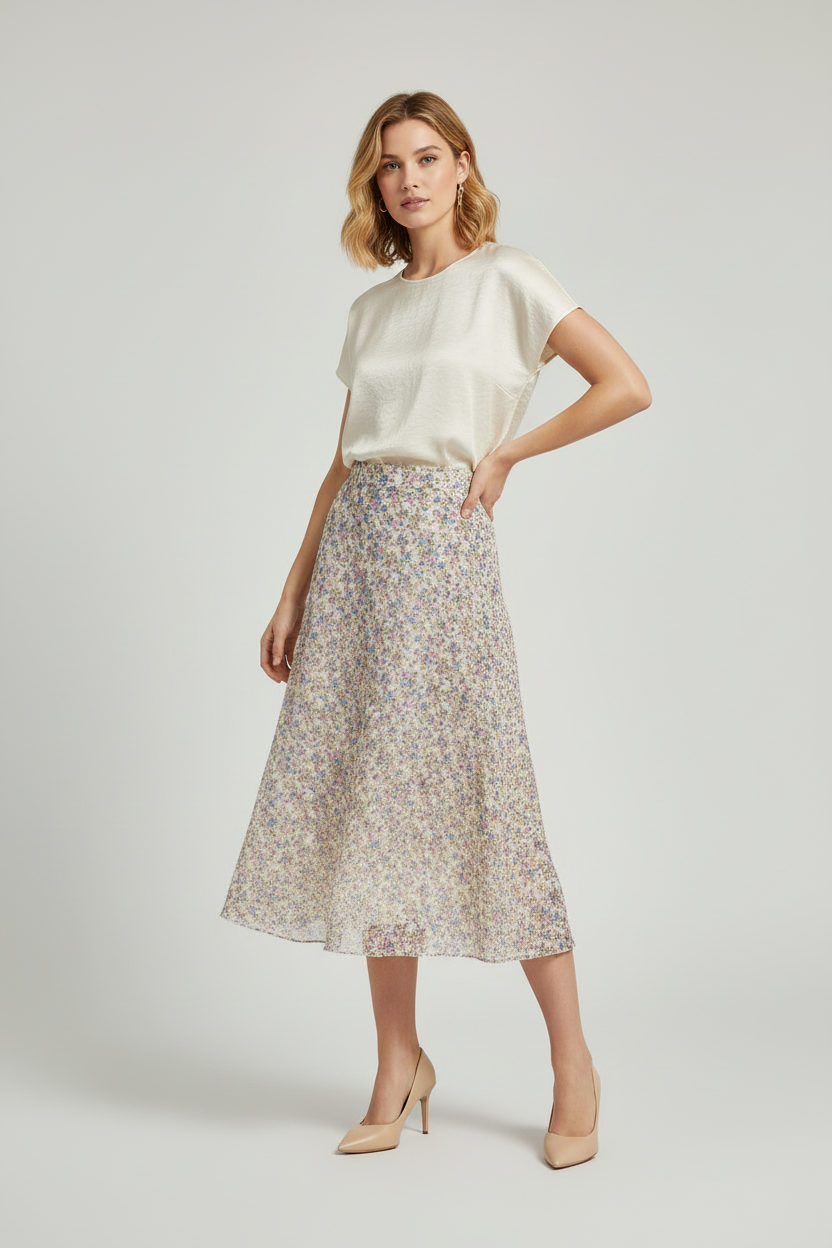 Morning Flower е миди пола с бежова основа и ситен цветен принт, завършена с прозрачен тюлен панел. Силуетът пада леко и прави визията по-ефирна, а полупрозрачният долен край добавя дълбочина и движение при ходене.