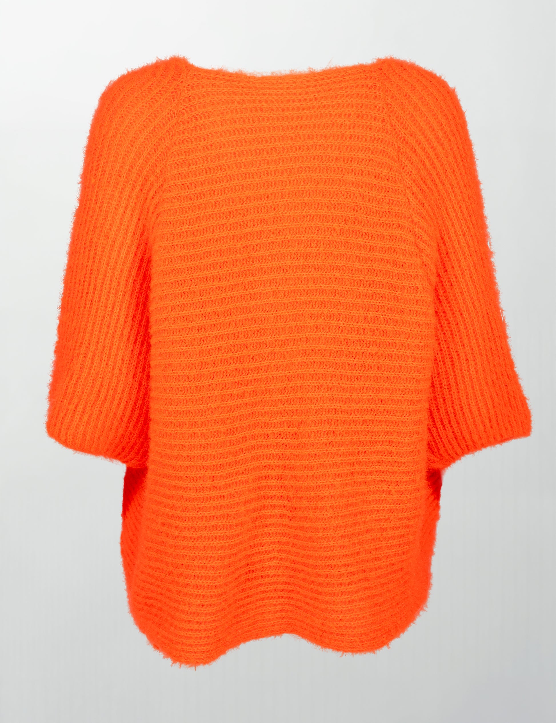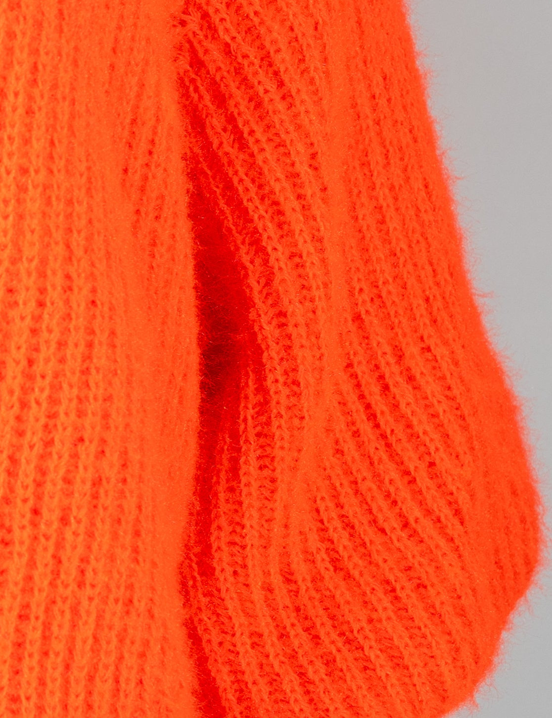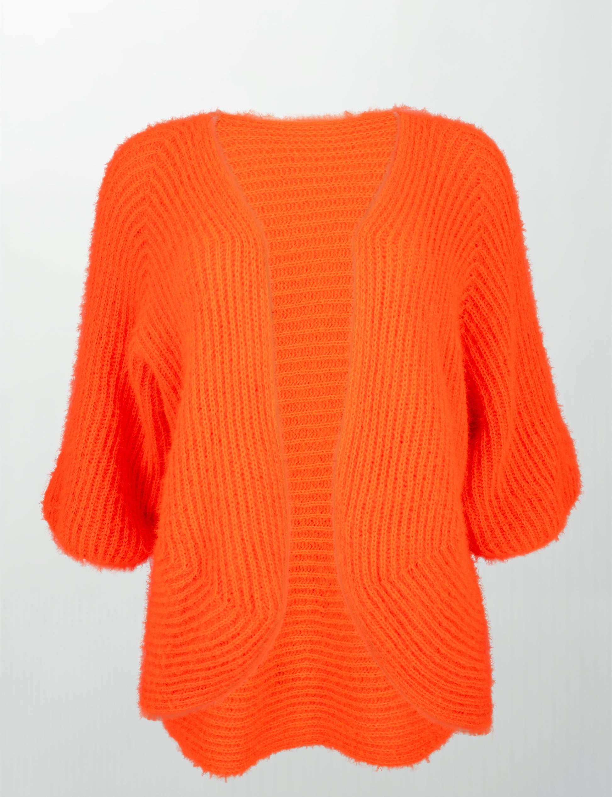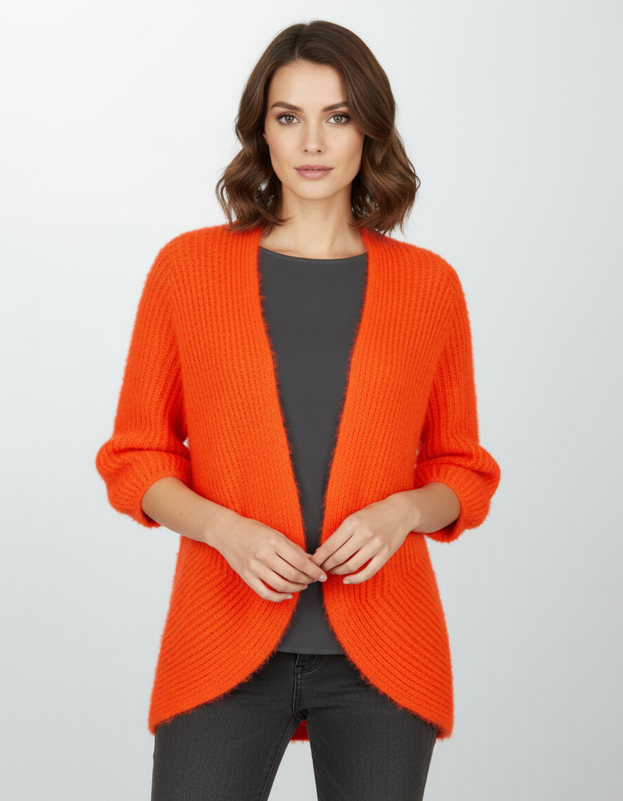 Пухкава, мека и визуално обемна жилетка в ярко оранжево с отворена предна част. Свободната линия пада красиво върху тялото и служи като изразен цветен акцент върху базови силуети. Подходяща за наслояване през по-хладните дни, без да тежи.