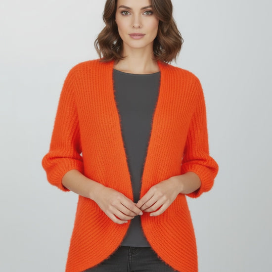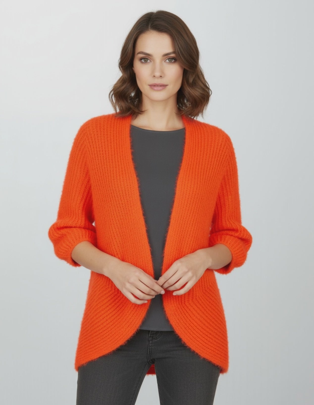 Дамска пухкава жилетка, мека и визуално обемна жилетка в ярко оранжево с отворена предна част. Свободната линия пада красиво върху тялото и служи като изразен цветен акцент върху базови силуети. Подходяща за наслояване през по-хладните дни, без да тежи.