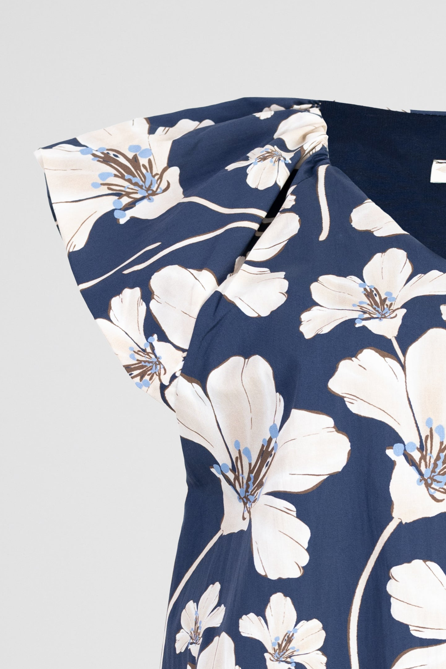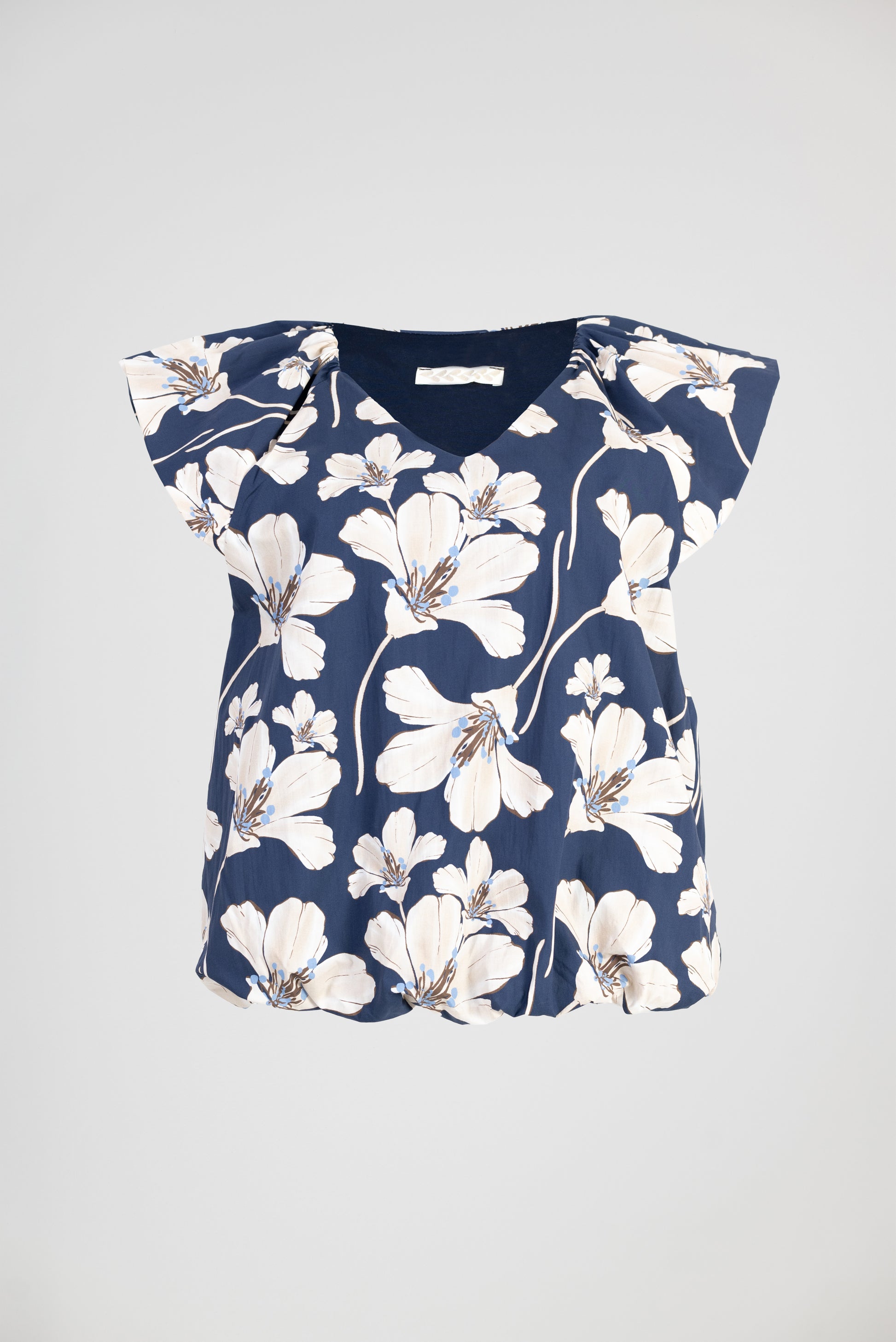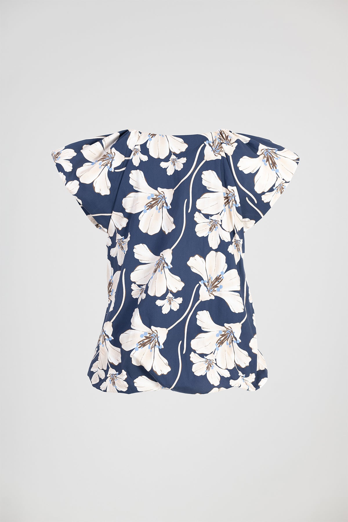 Noir Fleur е памучна блуза в тъмносиньо с едър флорален десен в екрю и деликатни светлосини акценти. Моделът носи свежо, женствено и стилно излъчване, а свободната линия стои леко и комфортно през целия ден.