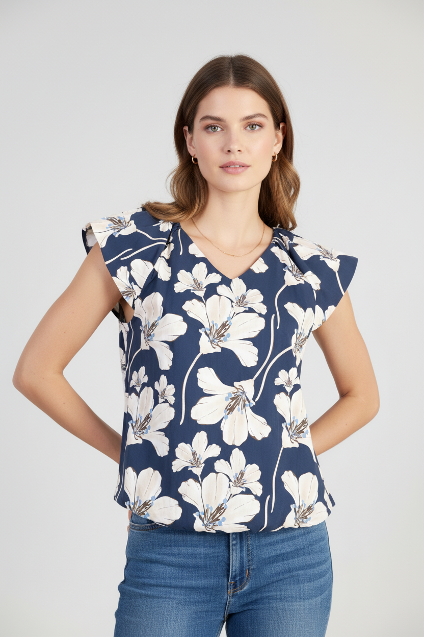 Носи я с бял панталон, светъл деним, пола в екрю или тъмносин панталон за подредена и стилна визия. Стои отлично както с равни сандали и кецове, така и с елегантни обувки за по-завършен вид. Добави семпли аксесоари, за да изпъкне красивият флорален десен.