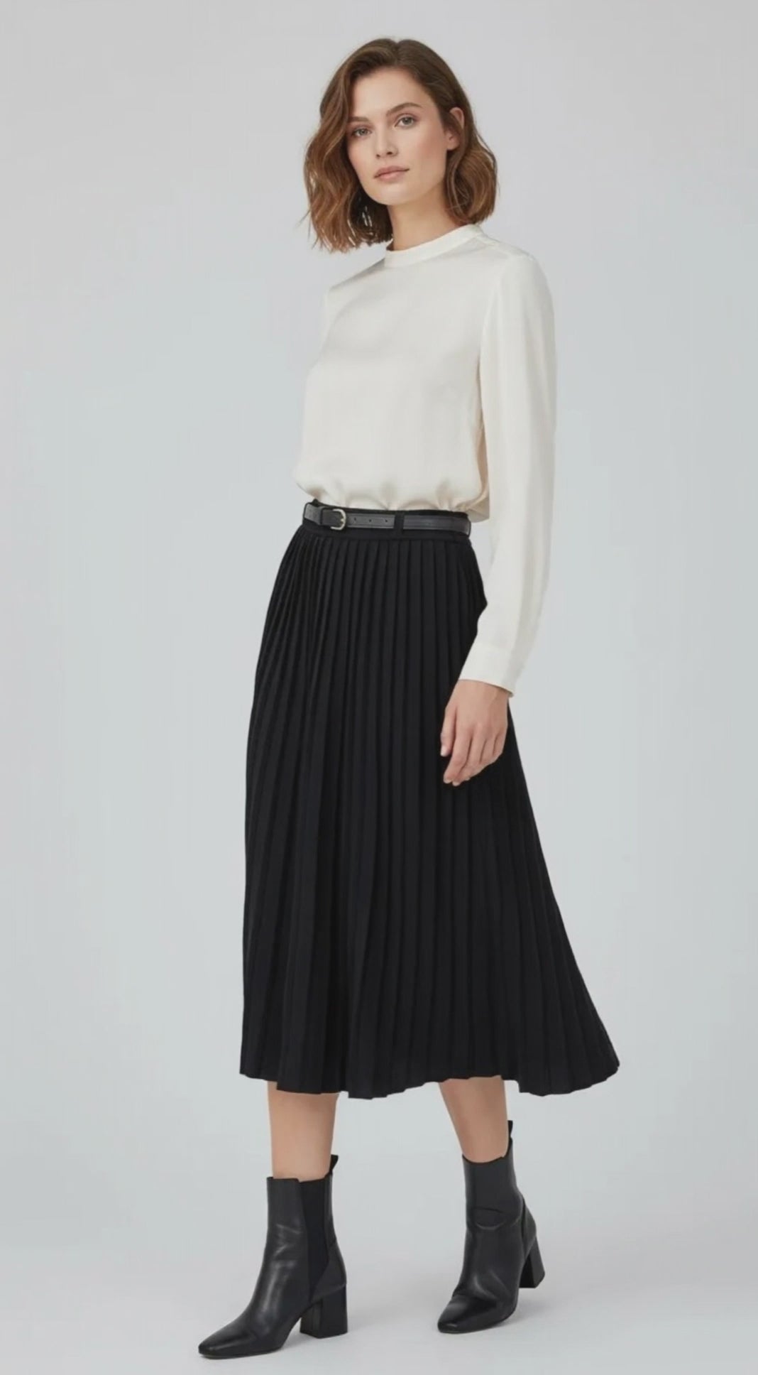Noir Pleat е изискана плетена плисирана пола в черен цвят, която впечатлява с класическата си плисирана линия и елегантен колан в талията. Изработена от мека и еластична материя, която запазва формата си и създава изтънчена визия с комфорт при носене. Универсален модел, подходящ за офис, срещи или ежедневна елегантност.