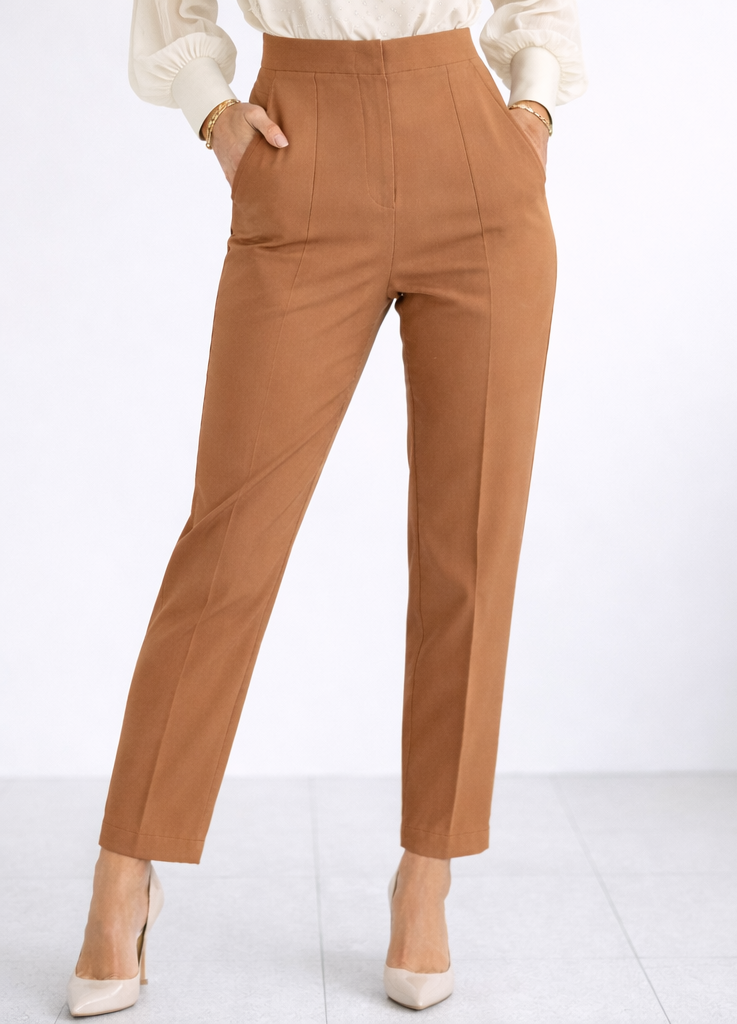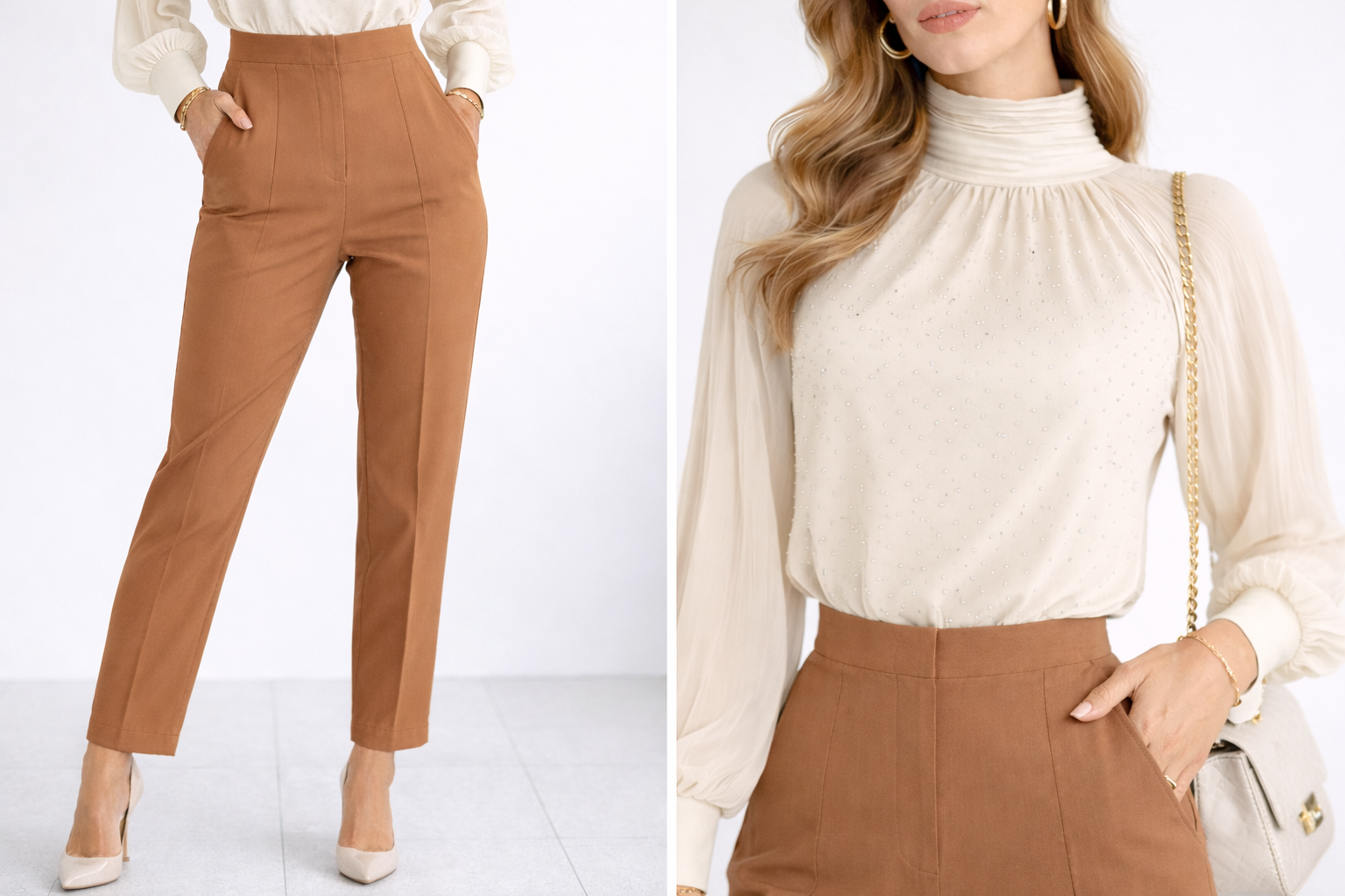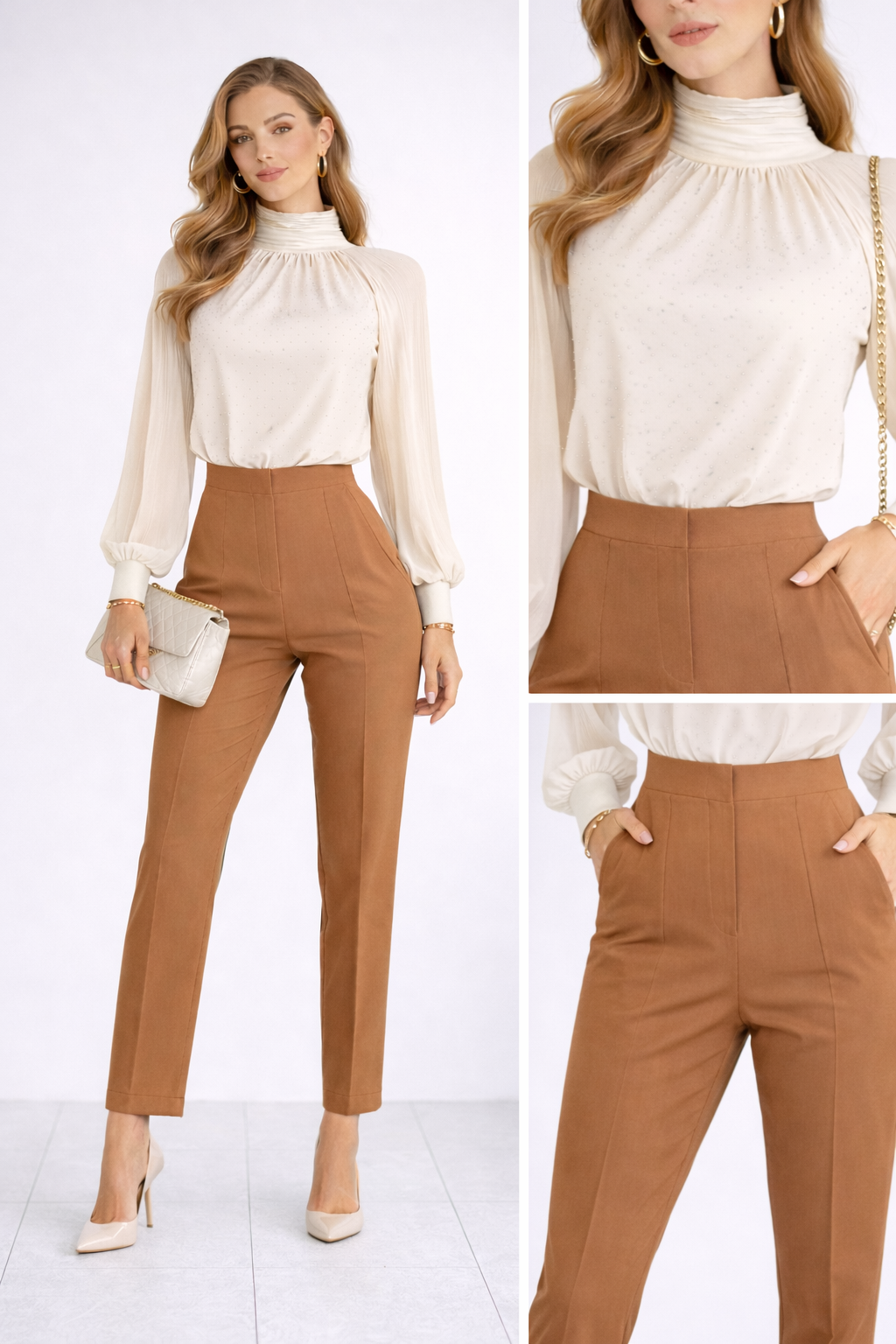 Блузата е в нежен крем нюанс с висока яка и ефектни, фино плисирани ръкави. Панталонът е в цвят морков с висока талия и прав крачол, който издължава и прави визията спретната. Комбинацията е подходяща за офис, срещи и вечеря, когато искаш елегантност без усилие.