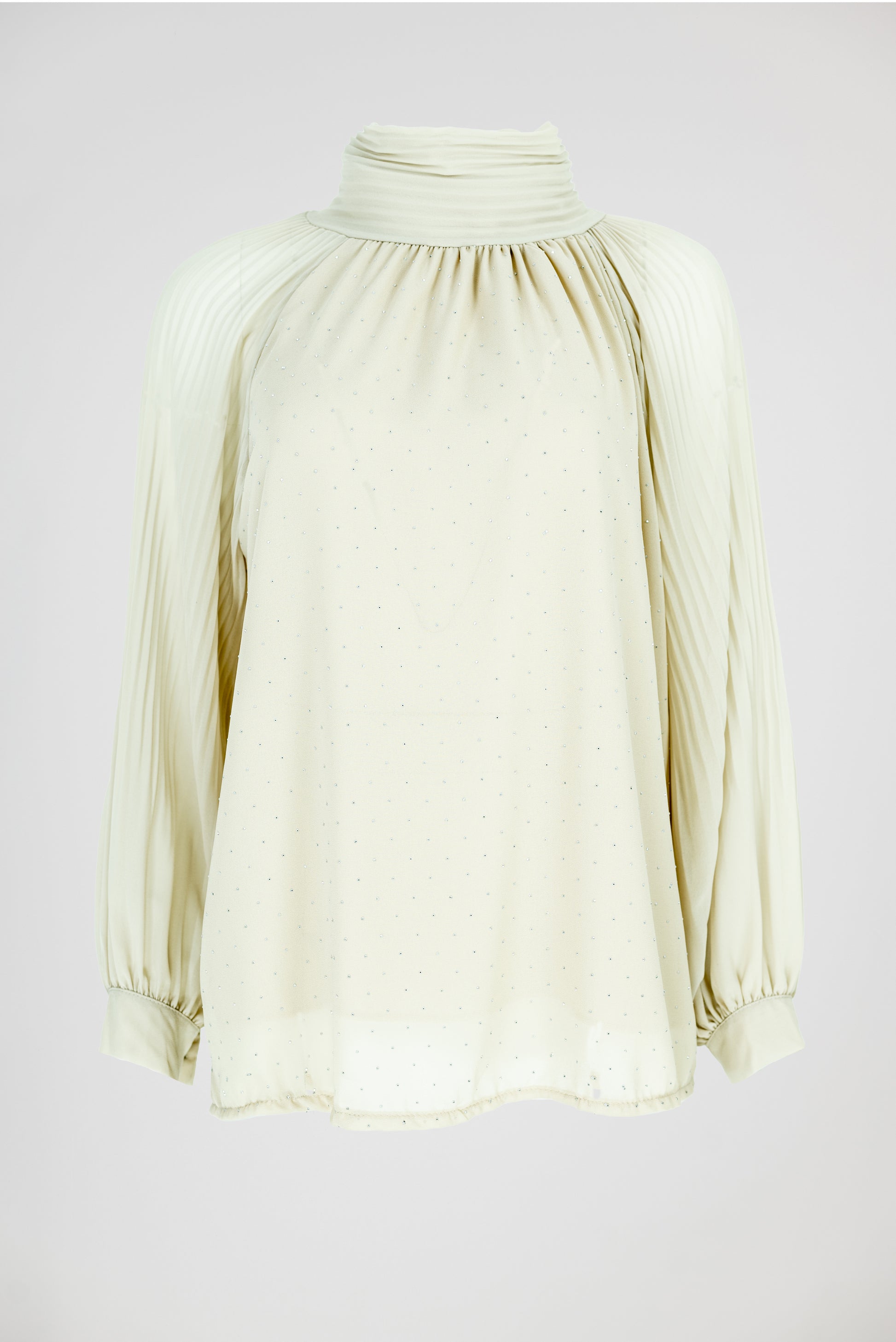Блуза: висока яка, свободна линия, плисирани ръкави, подплата