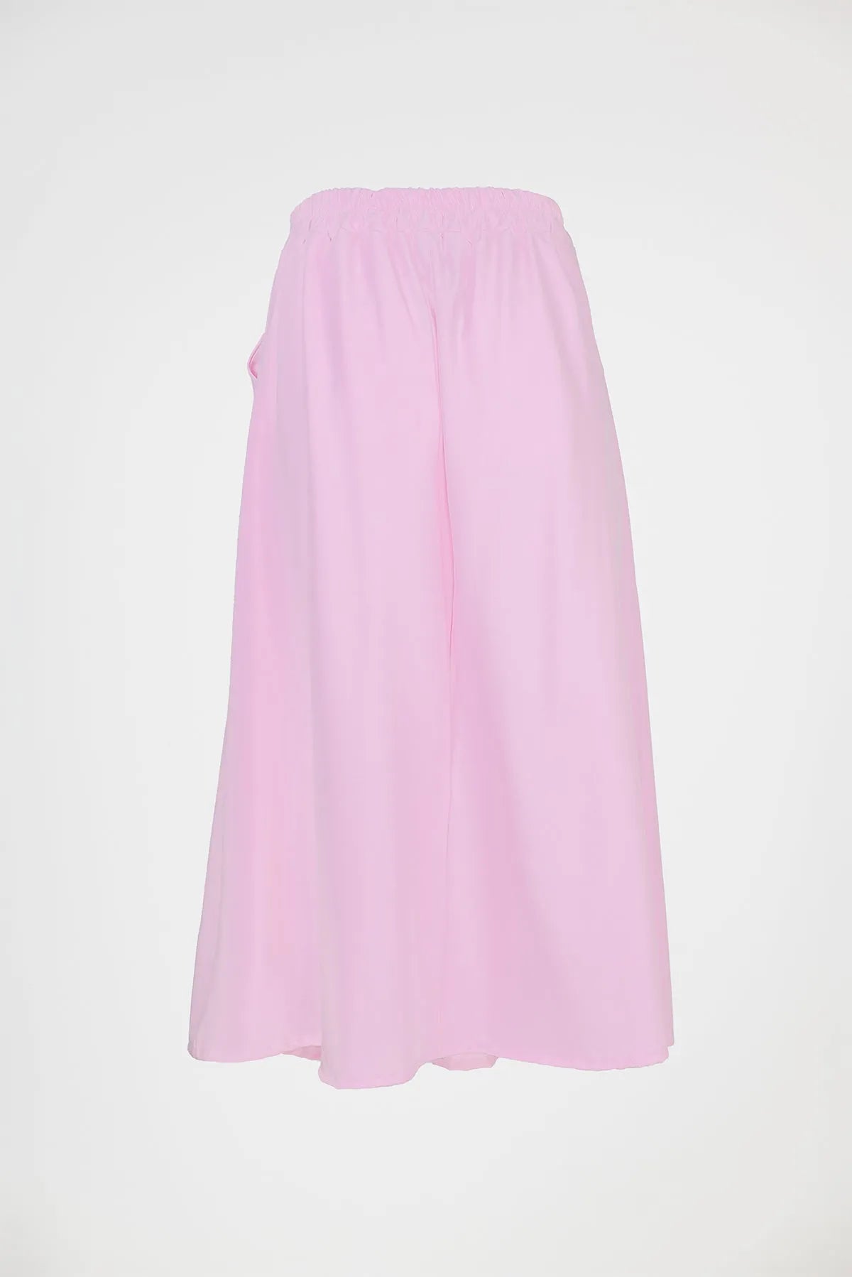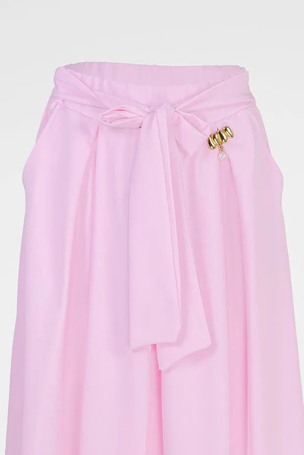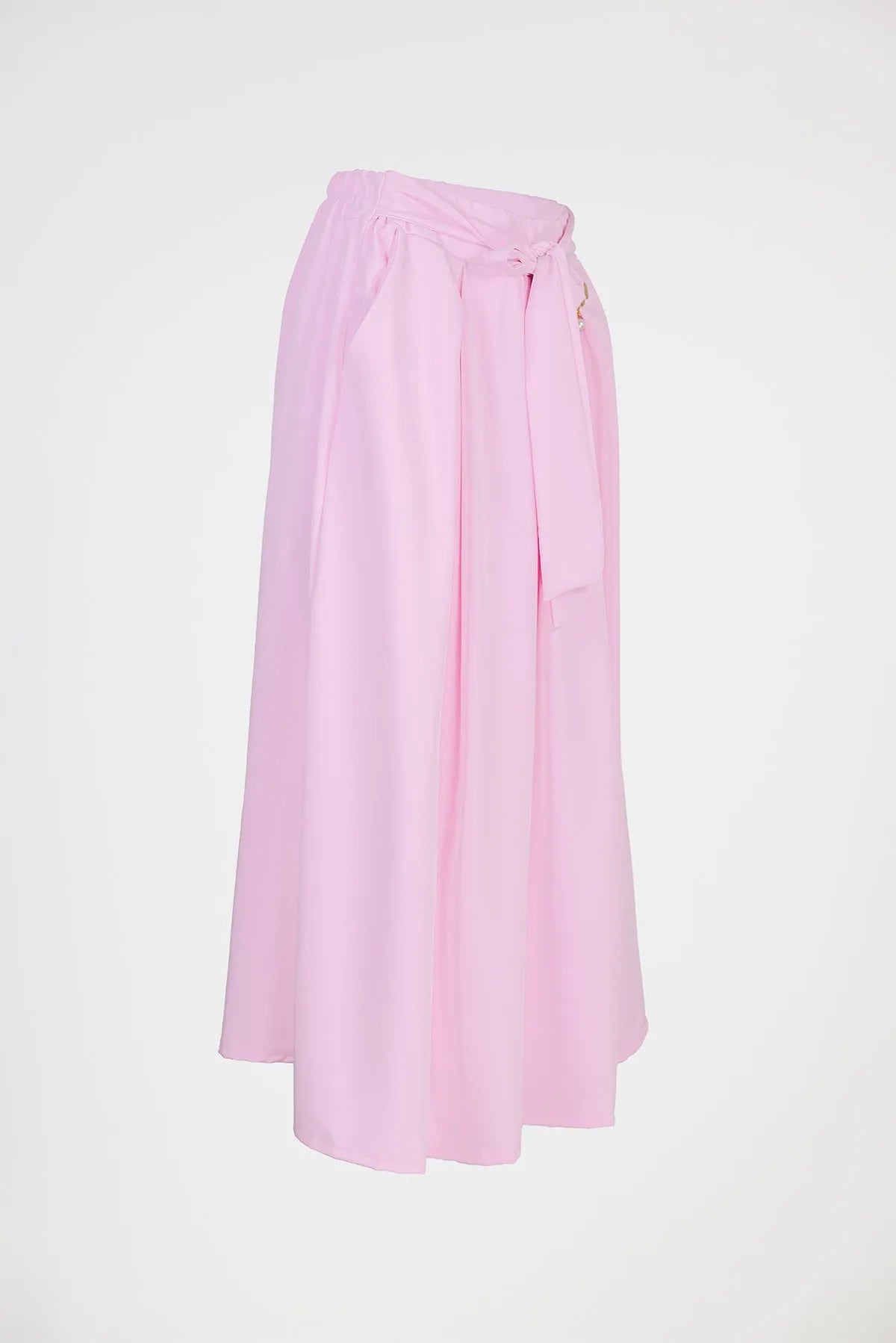 Pink Ribbon е дамска миди пола в нежен розов нюанс с дължина до над глезена и красива линия, която стои леко и елегантно в движение. Еластичната талия приляга комфортно, а коланът за връзване оформя талията и дава завършен вид. Материята с вискоза пада меко и приятно върху тялото, полиестерът помага да запази формата и цвета, а еластанът добавя свобода при движение.