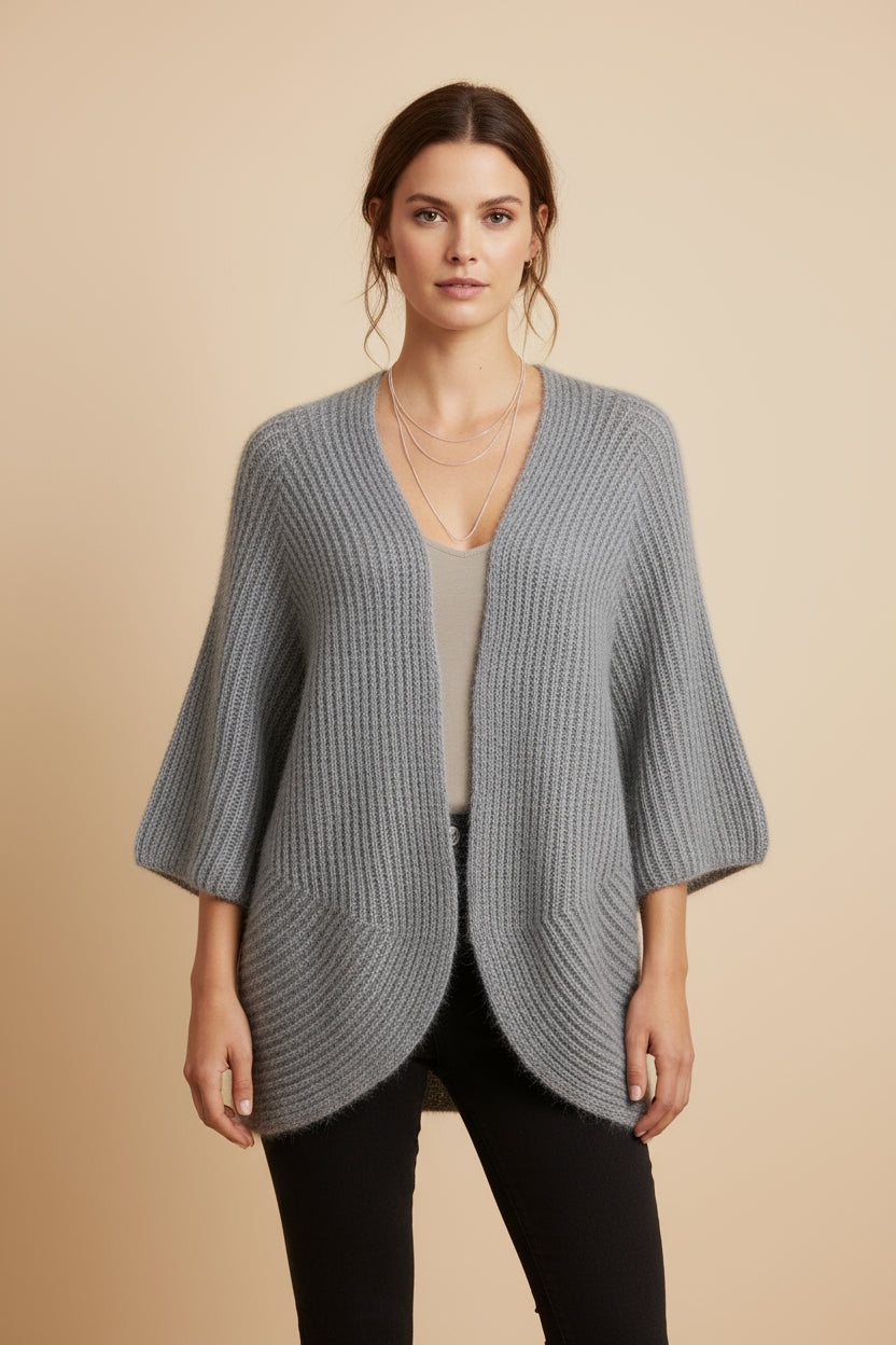 Пухкав „мохер“ ефект и релефна плетка Свободна кройка без закопчаване Ръкав 3/4 за комфорт и пластове Универсален размер – покрива до 2XL