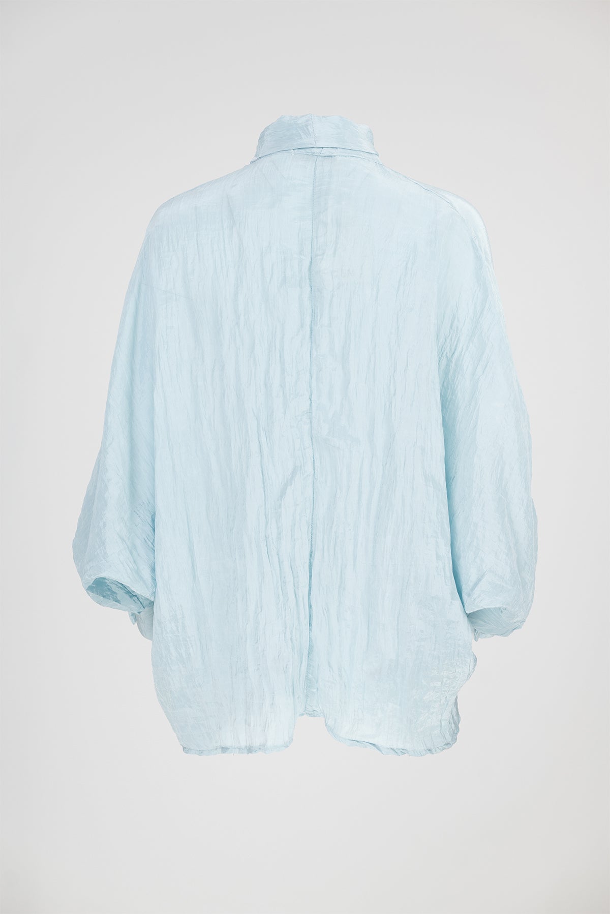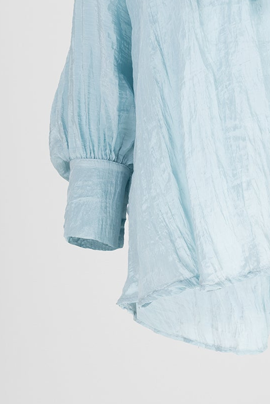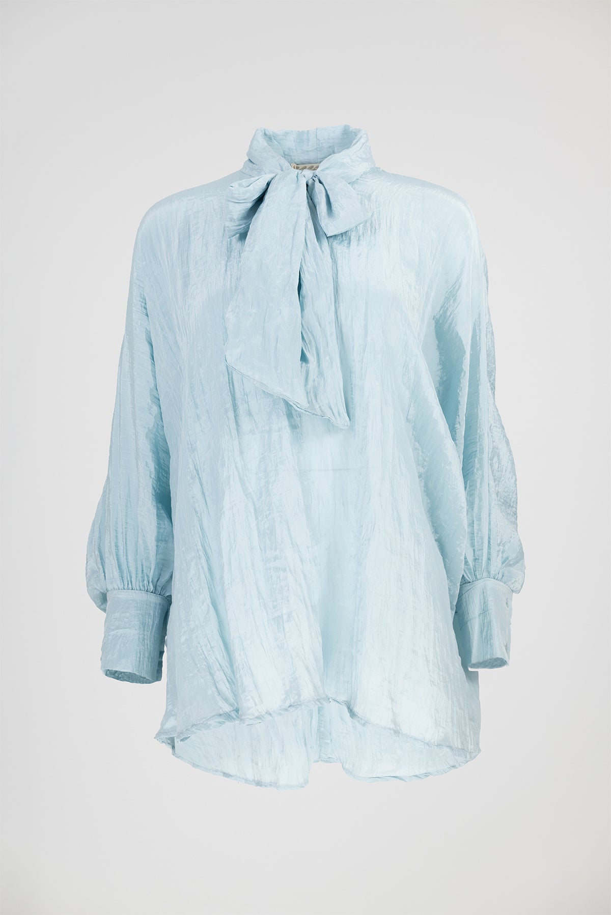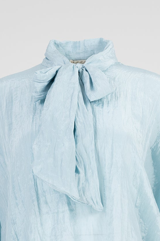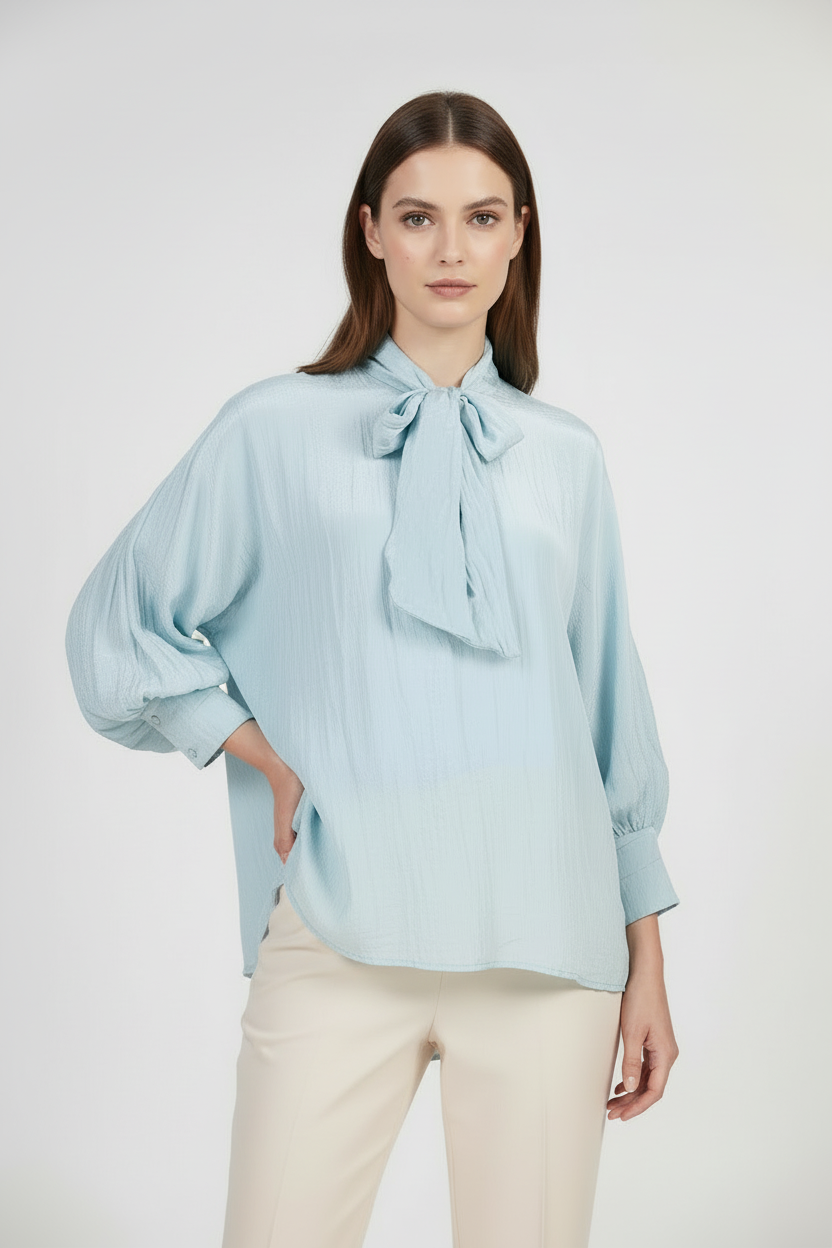 Sky Bow е свободна блуза в небесно синьо с панделка на яката и обемни ръкави, която прави визията подредена още от първото обличане. Материята от 100% полиестер е лека, държи форма и стои леко, без да натежава. Свободната кройка дава комфорт, покрива ханша и не очертава, а текстурата с фин „намачкан“ ефект стои интересно и държи стилен вид през деня. Универсалният размер до 3XL прави модела удобен избор за офис, срещи и ежедневие, когато искаш цвят и силует с характер.