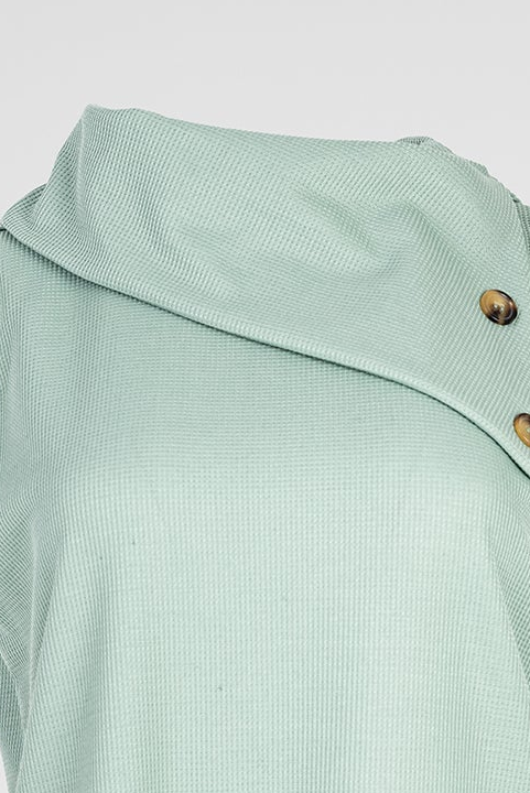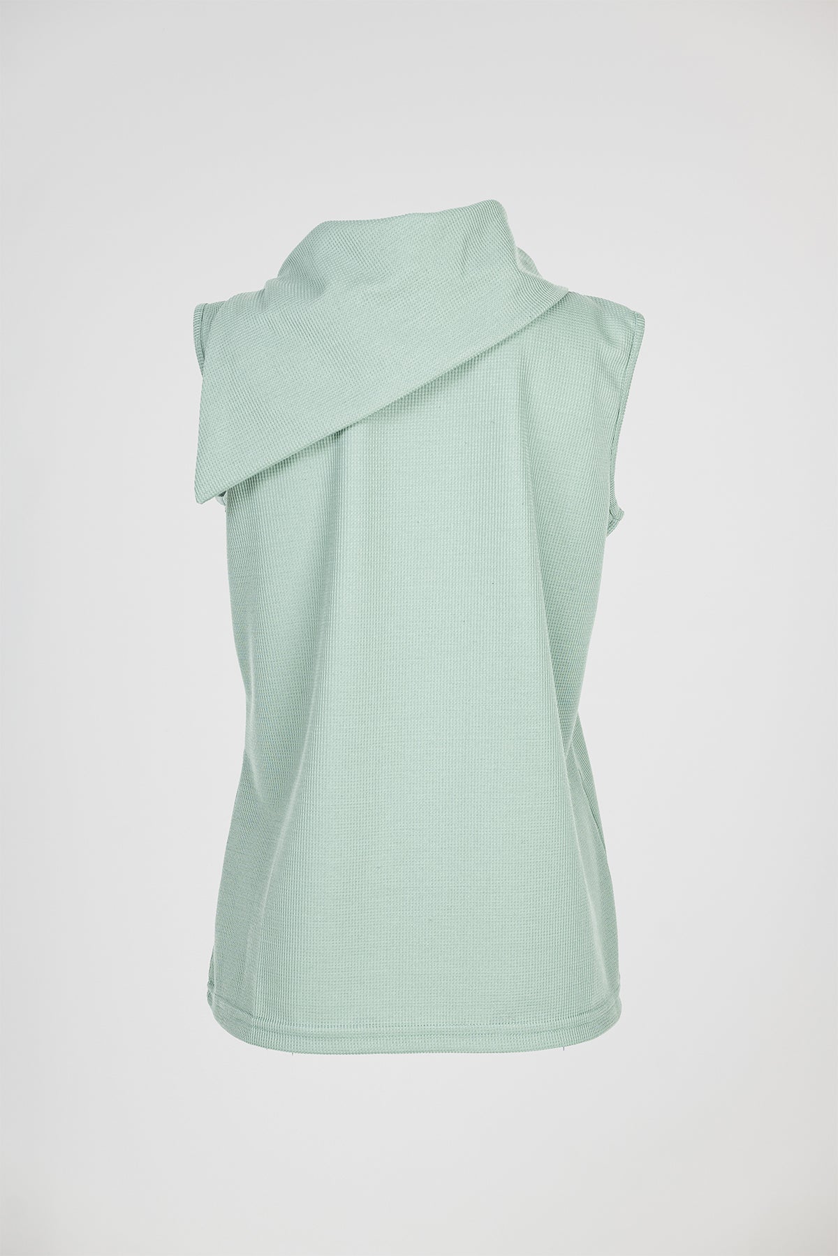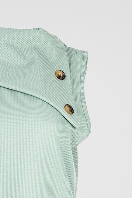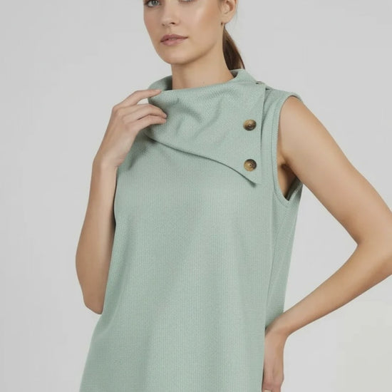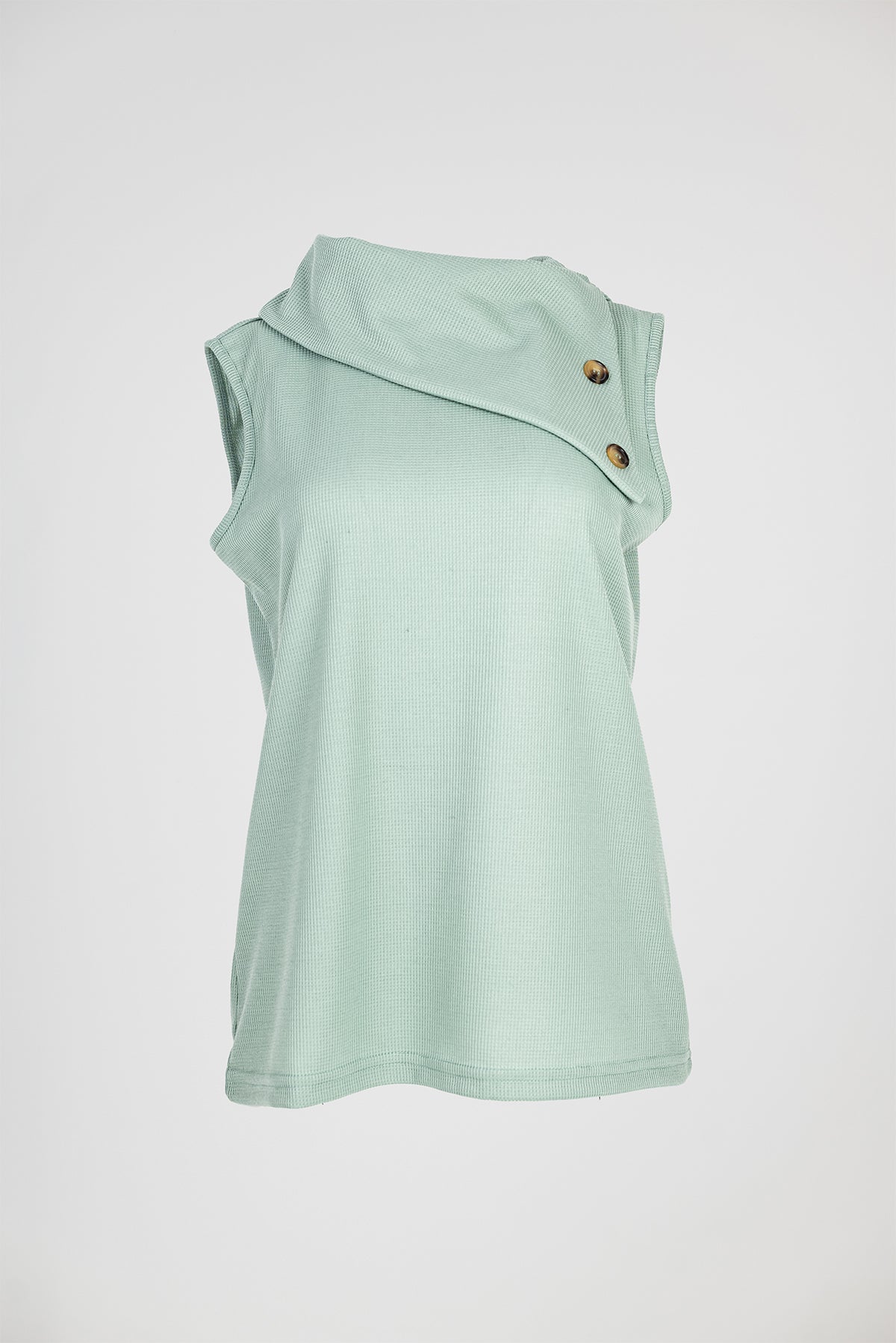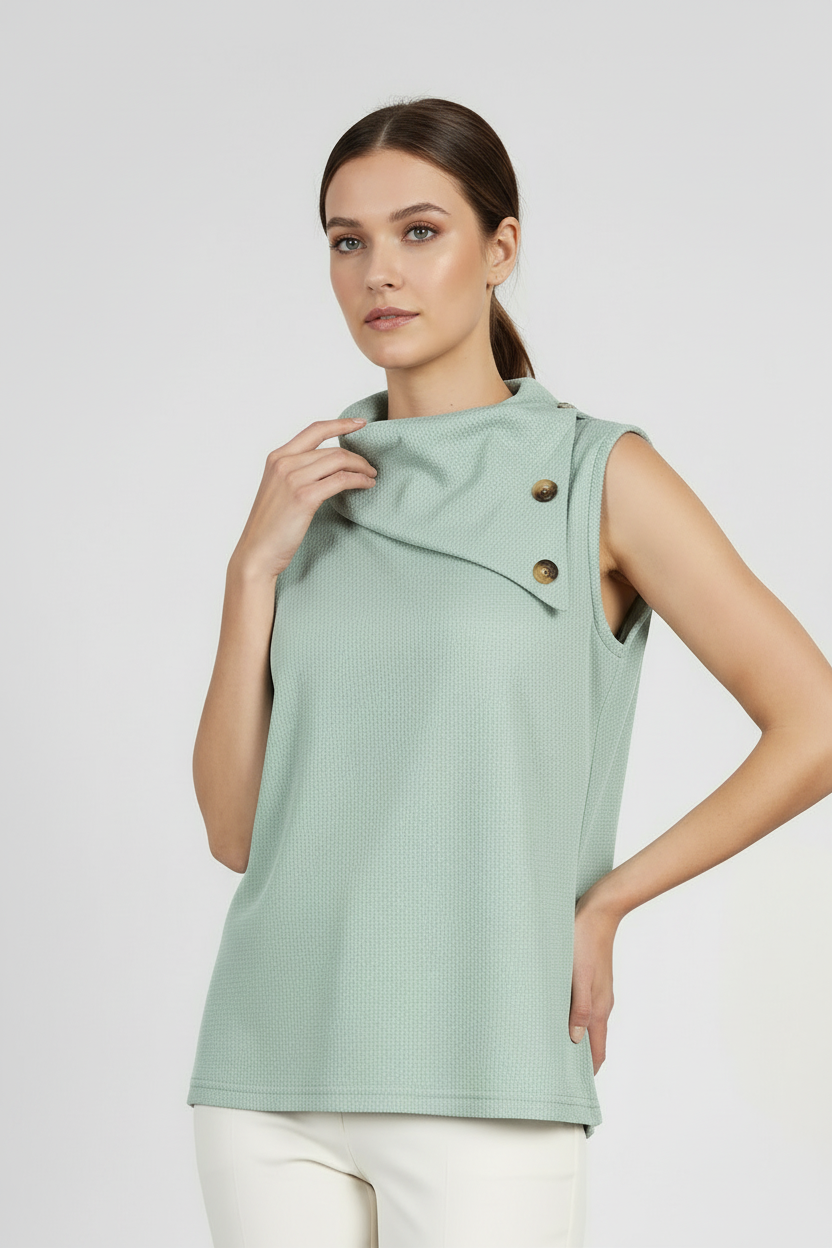 Топът Soft Edge в ментов цвят е изчистен модел без ръкави с асиметрична яка и декоративни копчета. Материята е гладка с фин релеф и стои подредено през целия ден.