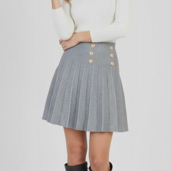 Soft Pleats е сива плисирана пола от меко плетиво с подчертана висока талия и декоративни златни копчета. Стои стабилно без да добавя обем, а плисето оптически издължава силуета. Подходяща за ежедневни и по-елегантни визии.