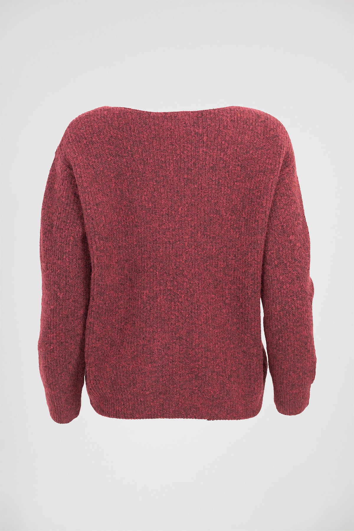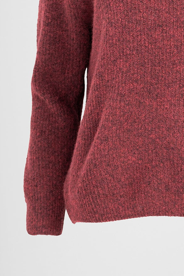 Комбинирай пуловера с прав панталон или дънки за ежедневна визия. Под сако или палто стои подредено и чисто за офис стил. Виненият меланж се съчетава добре с черно, сиво, бежово и деним.