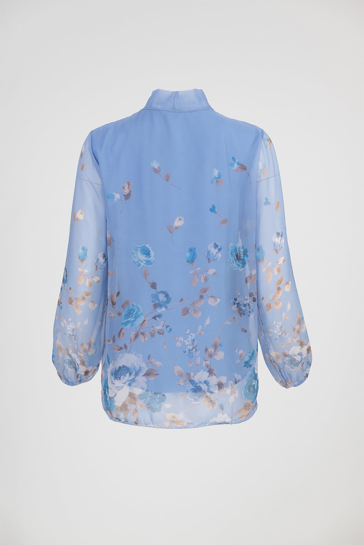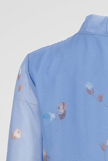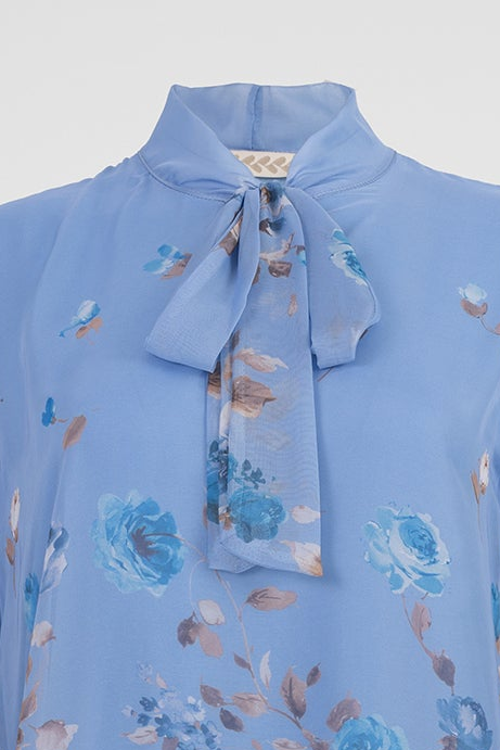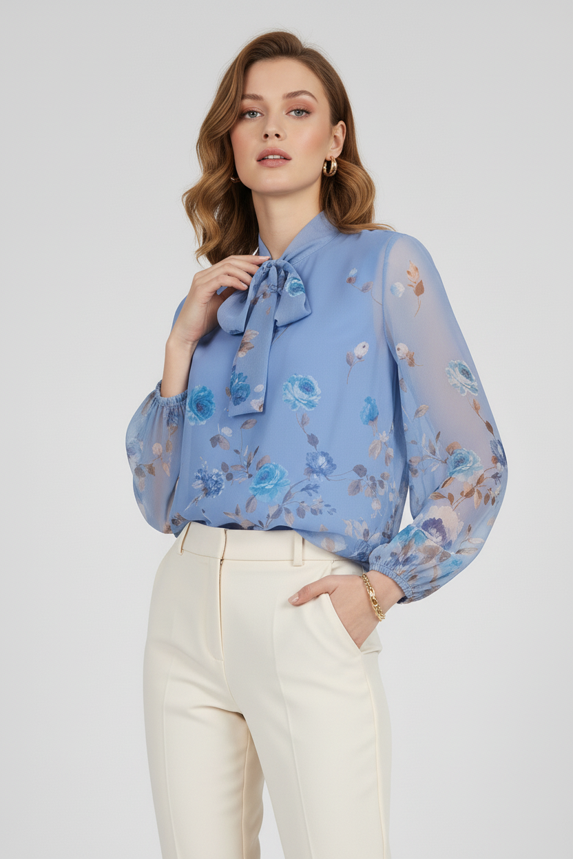 Soft Sky е ефирна дамска блуза с деликатен флорален принт в небесносин нюанс. Меката падаща материя стои леко по тялото и създава женствен силует без стягане. Панделката при яката оформя акцент и прави визията спретната без усилие.