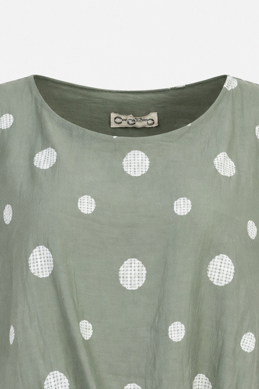 Summer Dots е дамска блуза с лек силует и свеж десен на точки. Връзката отпред ти дава контрол върху формата и създава по-женствена линия. Свободната кройка стои леко и не ограничава движението.