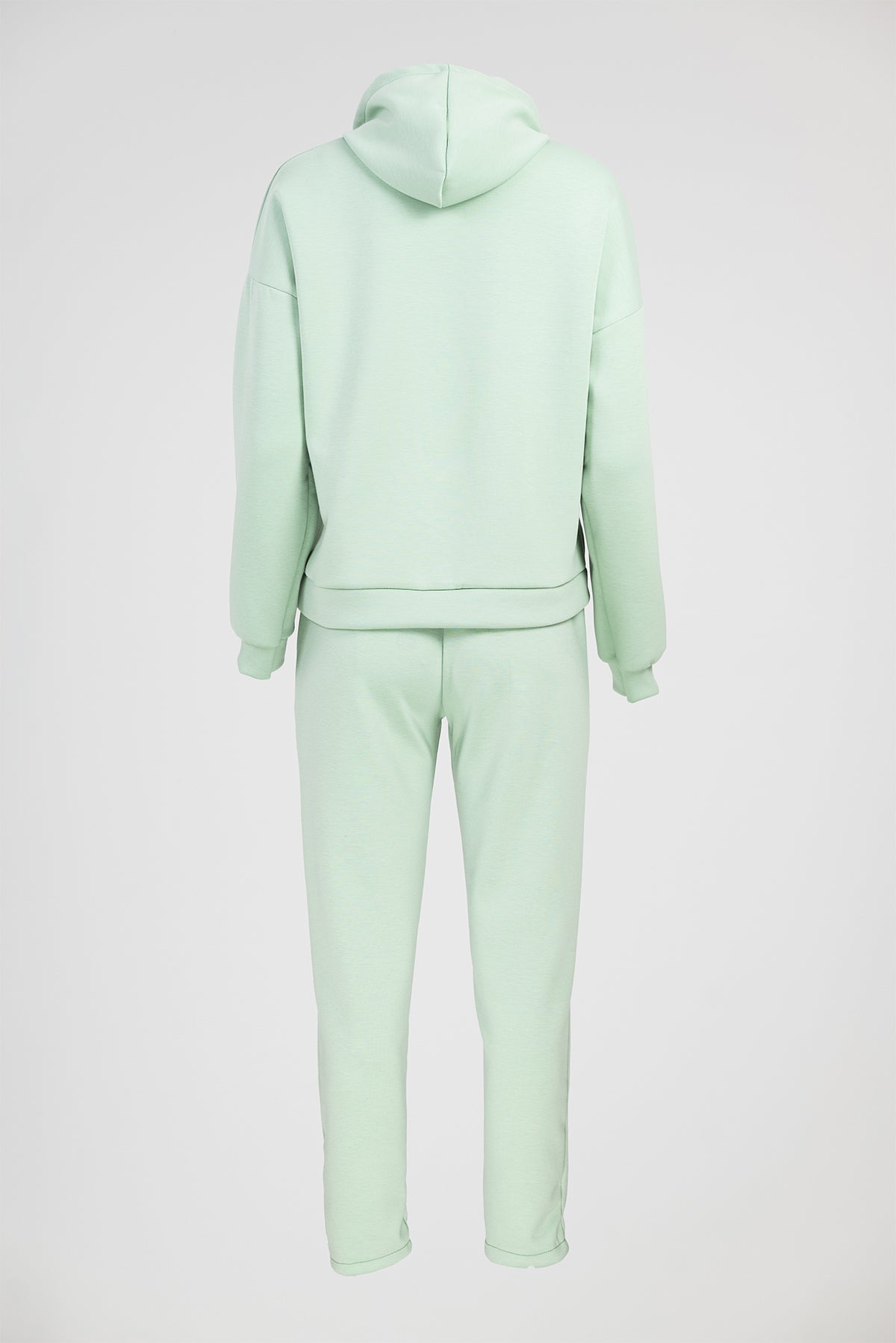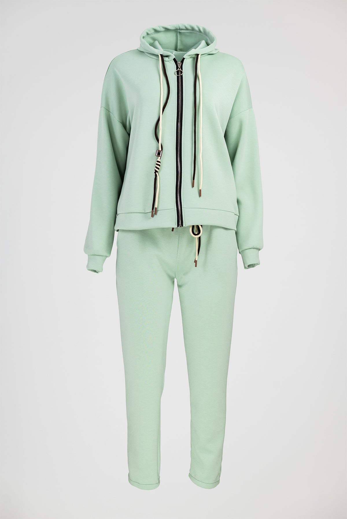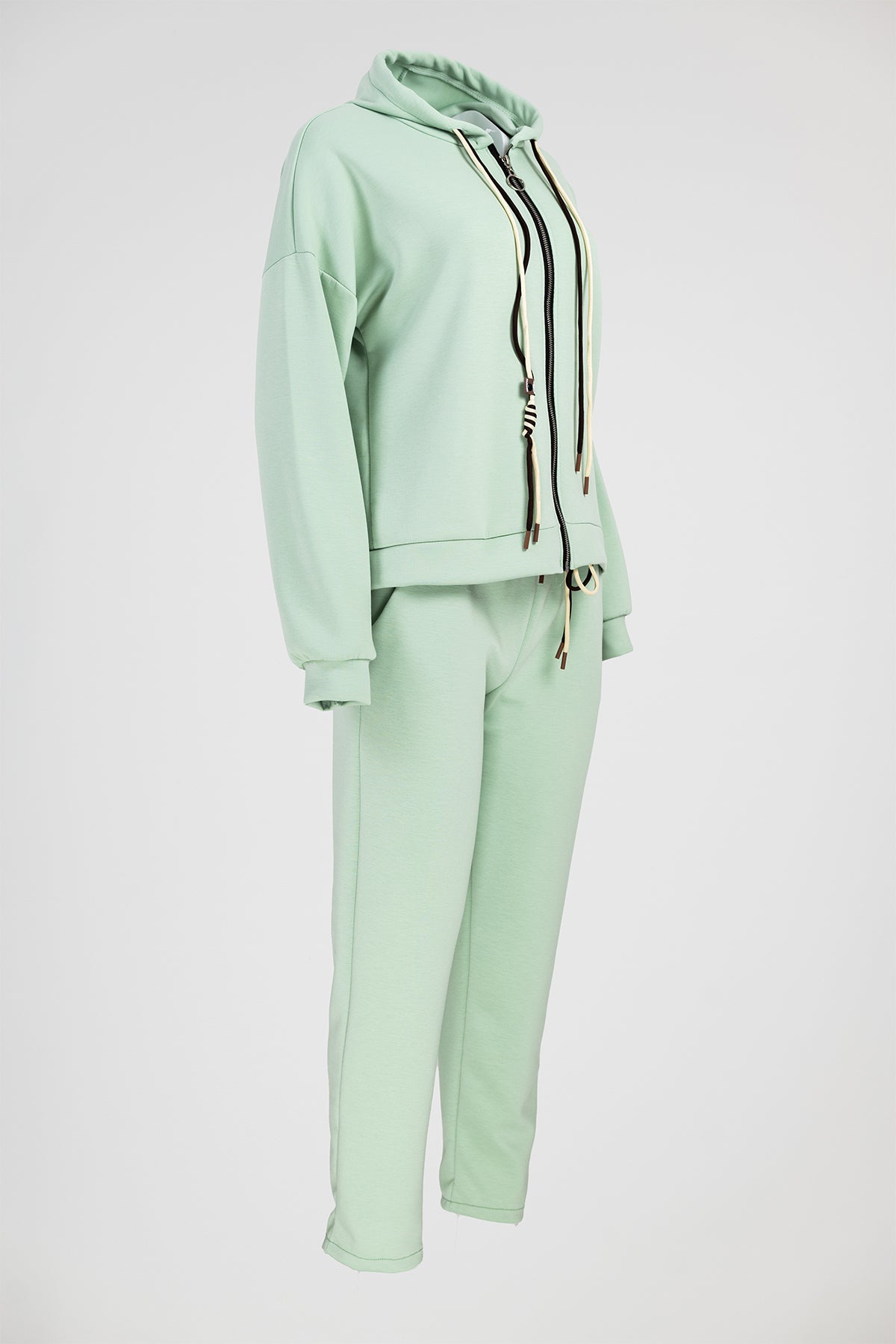 Горната част е с качулка и цип по цялата дължина. Линията е свободна с паднало рамо и маншети, които държат силуета подреден. Панталонът е с ластичен колан и връзка за регулиране, а крачолът стои прав и изчистен.