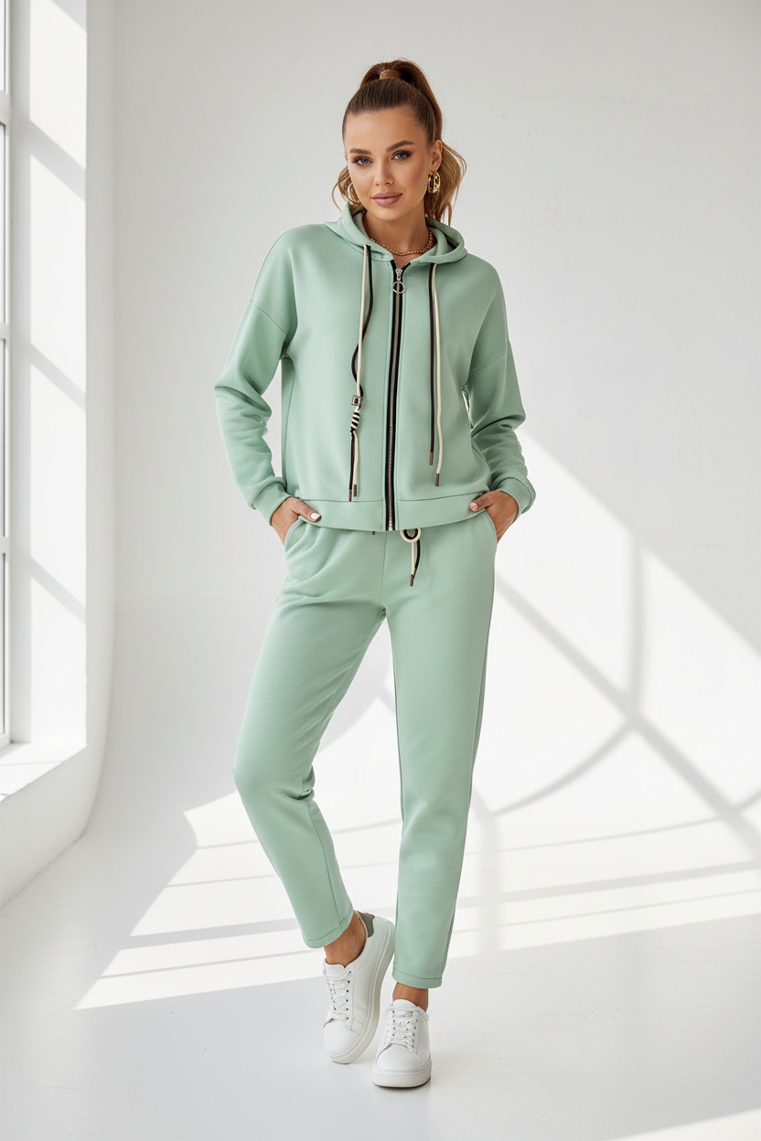 Sunny Zip Set е дамски комплект в ментов цвят с предимства, които се усещат през целия ден: мека материя с вискоза за приятен допир, еластан за леко разтягане и по-добро запазване на формата, плюс удобна кройка за свобода в движение.