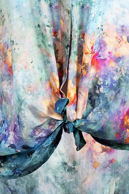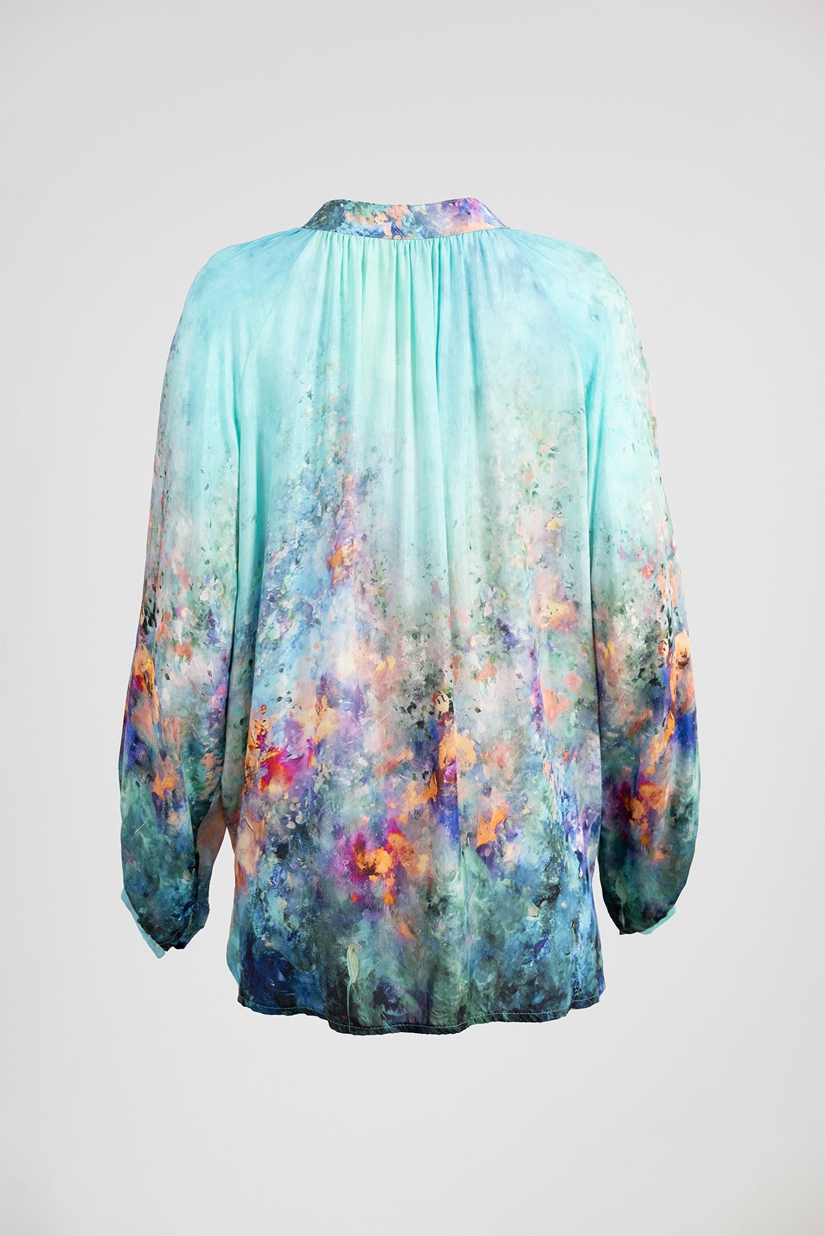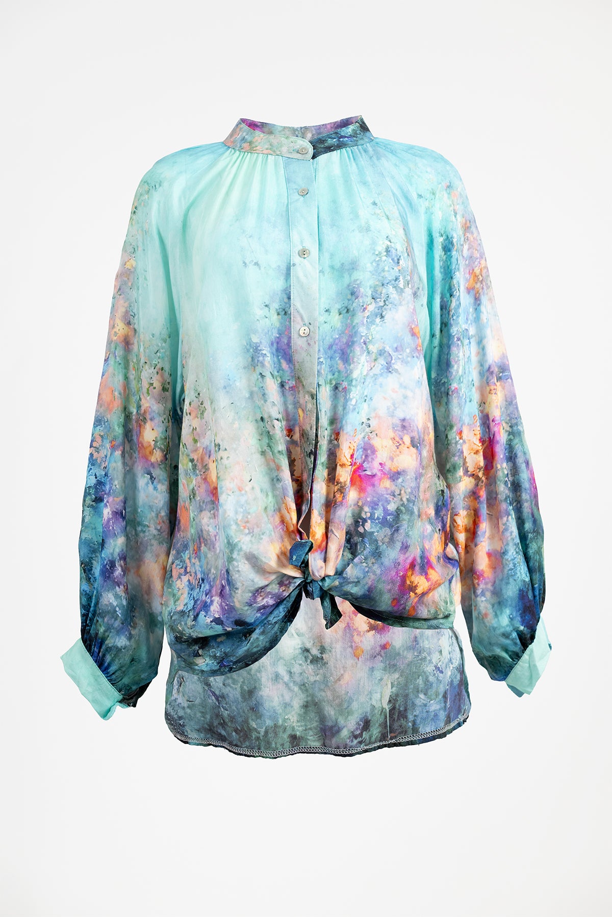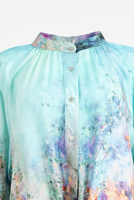 Риза: копчета отпред, свободна линия, ефектен акварелен принт