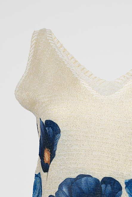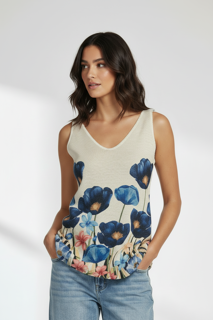 Blue Garden привлича погледа с наситен флорален принт и мек блясък. Горната част е изчистена, а долната преминава в цветен мотив, който създава баланс и акцент.