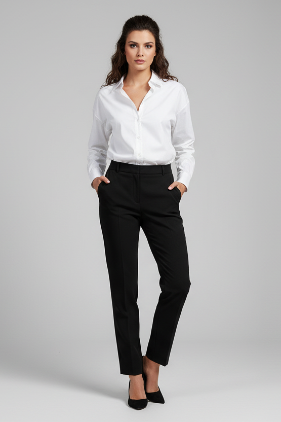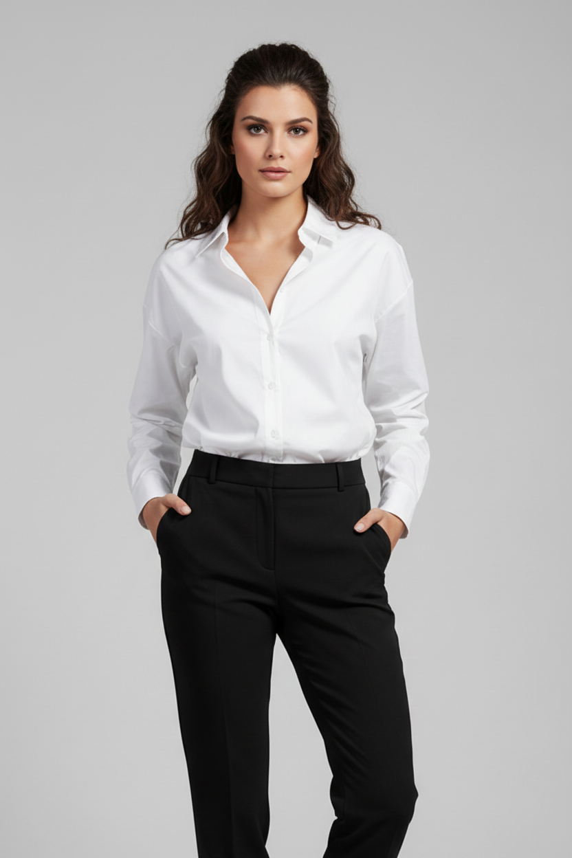 Носи White Ease с тъмни дънки и колан за чиста ежедневна визия. За офис комбинирай с панталон с висока талия и сако. За по-небрежен стил остави ризата леко свободна и подгъни ръкавите.
